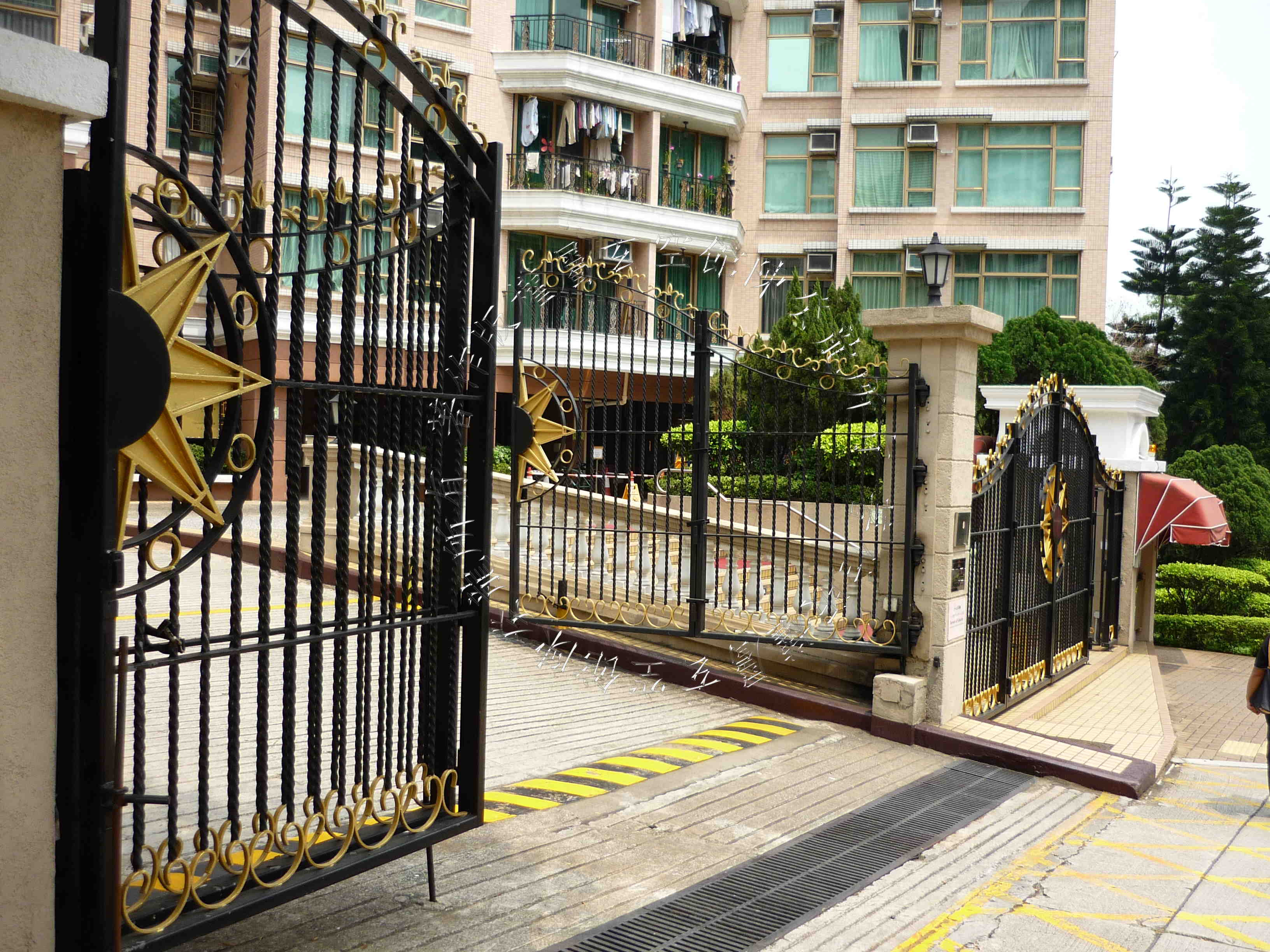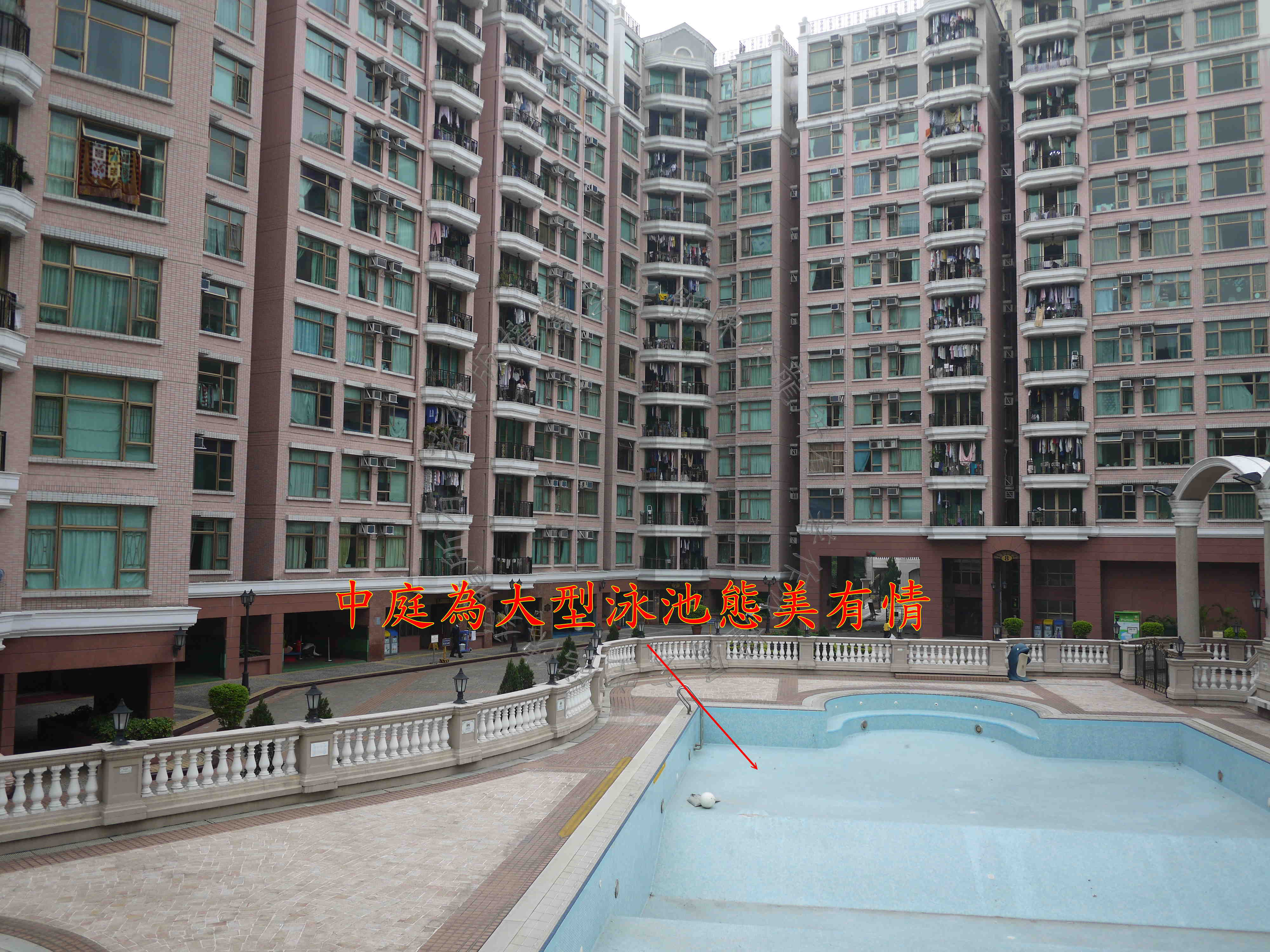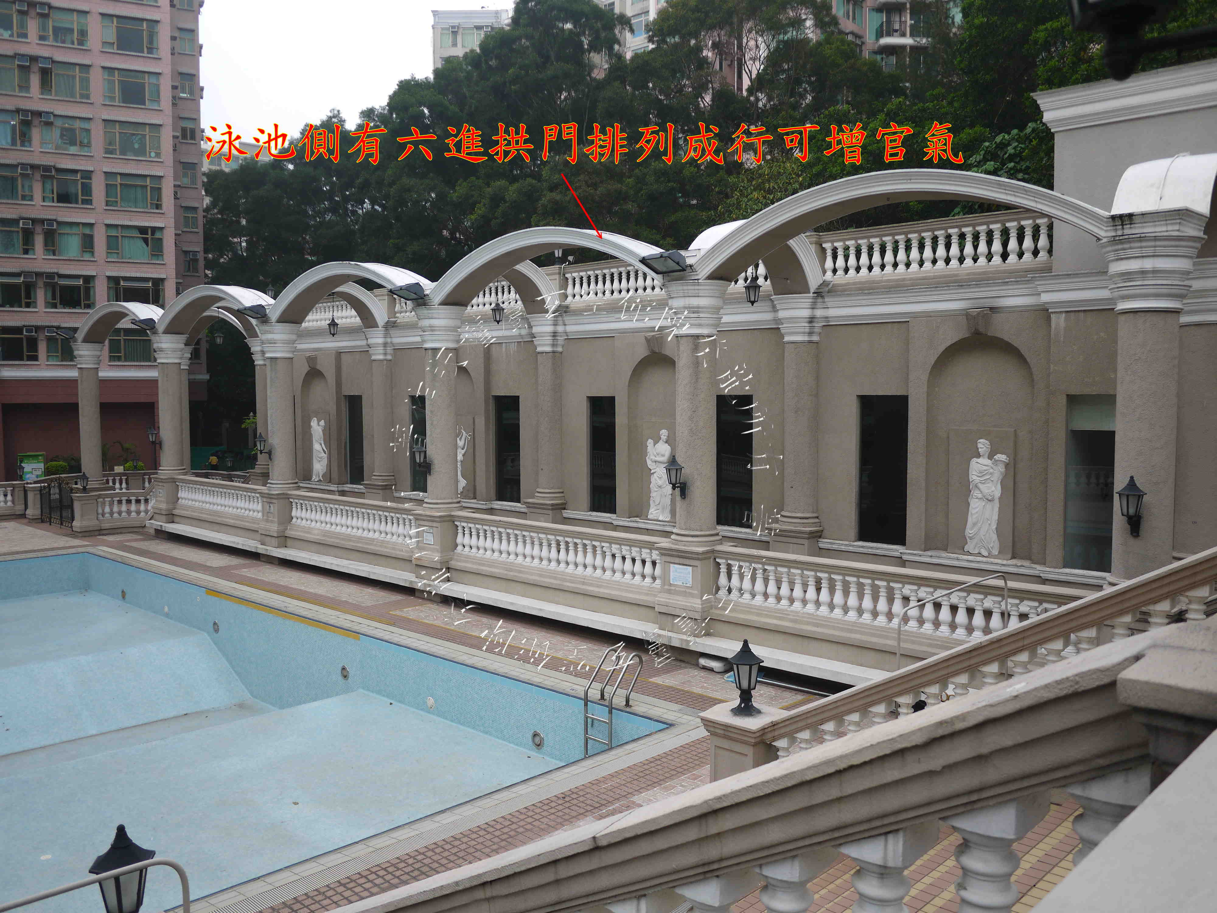 屋苑入口在南方离宫,旁见四马水池吉象,可增财气。 中庭为大型泳池,态美有情,且旁有双潭水,喜得财星八白加临,定生催财之妙。 泳池侧有六进拱门,排列成行,可增官气。 惟屋苑外围于北面坎方见孤树煞,邻近单位需注意宅中妇孺健康。