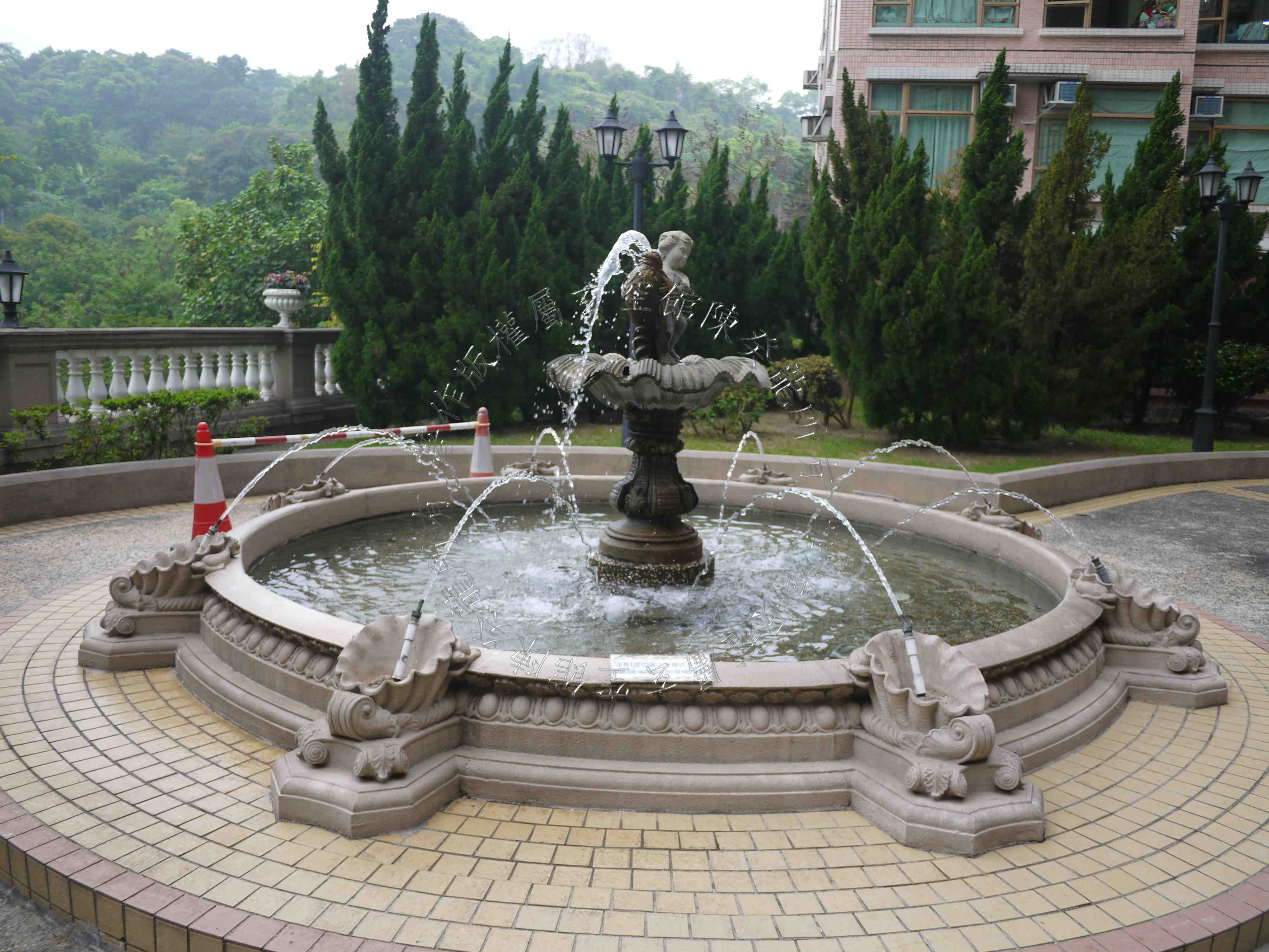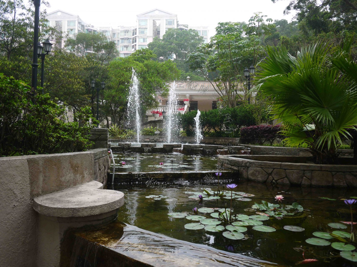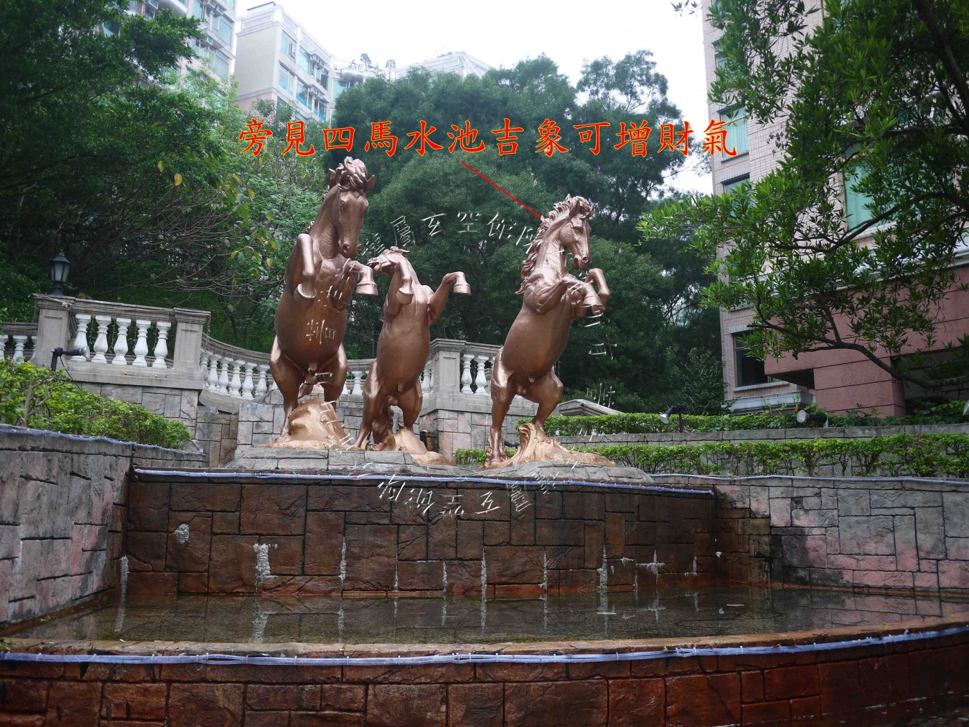 屋苑入口在南方离宫,旁见四马水池吉象,可增财气。 中庭为大型泳池,态美有情,且旁有双潭水,喜得财星八白加临,定生催财之妙。 泳池侧有六进拱门,排列成行,可增官气。 惟屋苑外围于北面坎方见孤树煞,邻近单位需注意宅中妇孺健康。