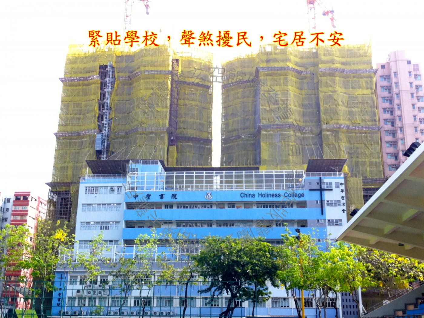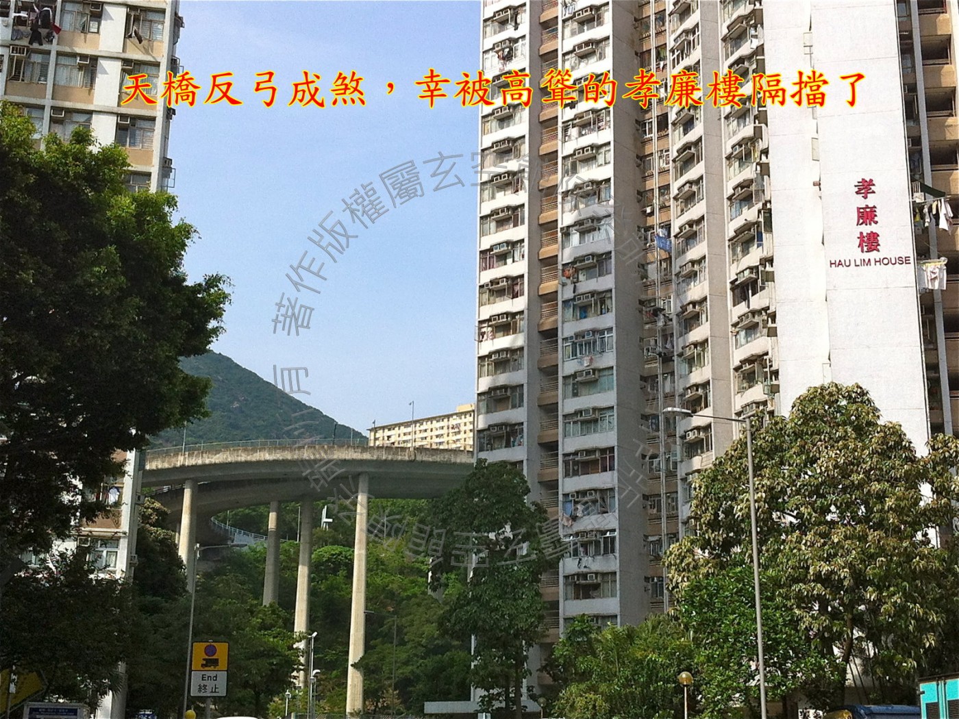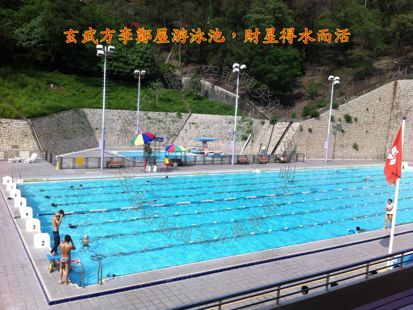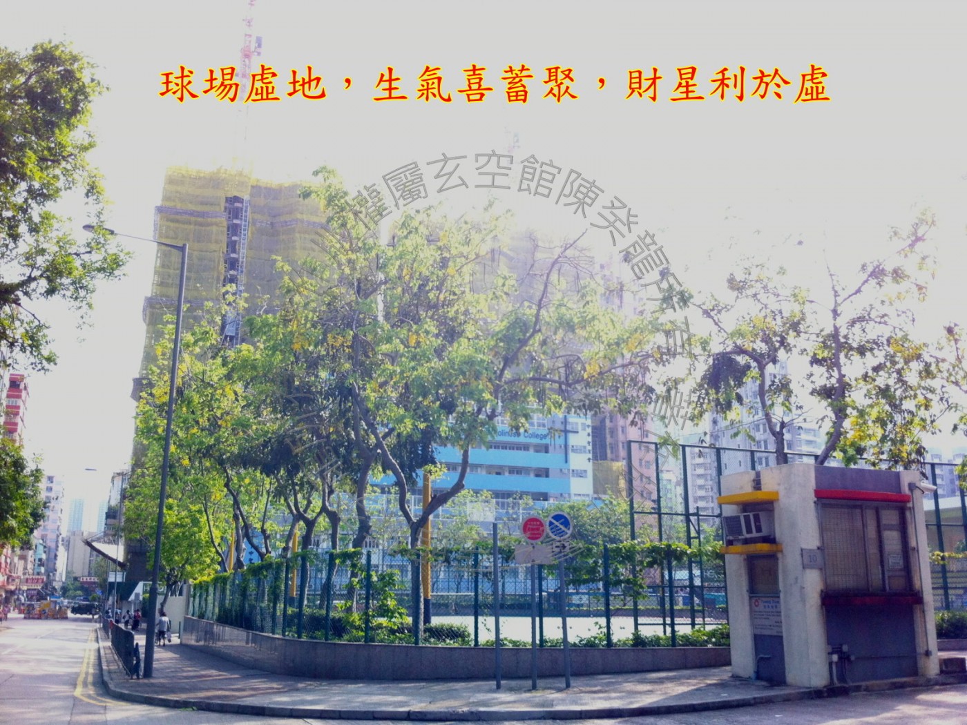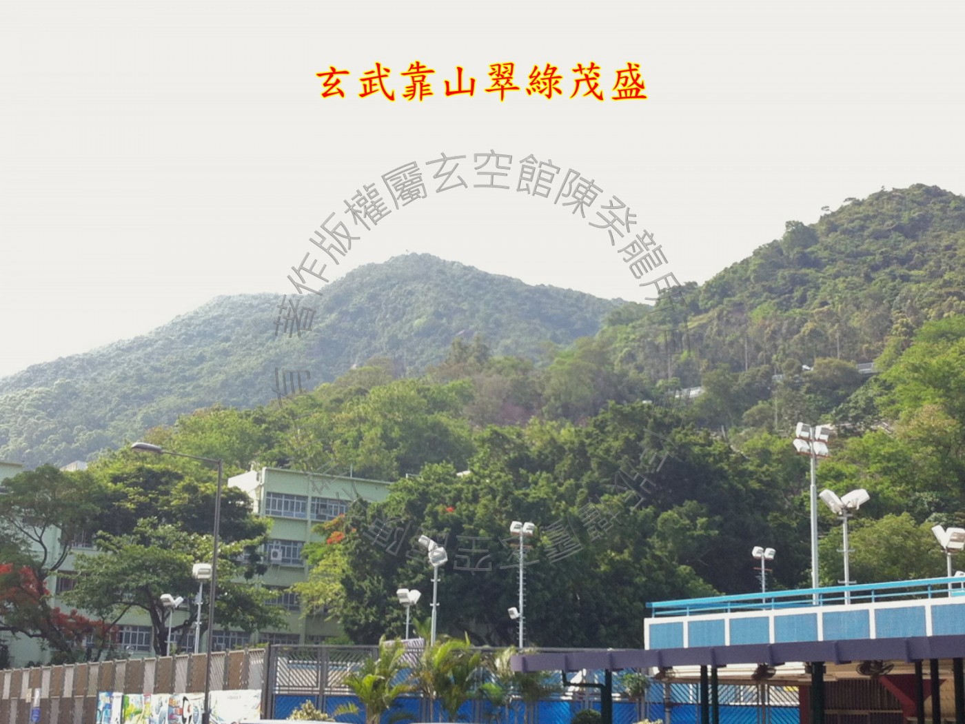 玄武后方,靠山翠绿茂盛,山势雄伟,此方见天桥路弯成反弓,凌空而立,亷刀煞破坏力强,幸距离较远又被高耸的孝廉楼隔挡了,凶性大减,无大碍; 此方见球埸虚地及李郑屋游泳池,生气蓄聚又得水而活,若令星或城门加临,财星得令,气运亨通; 近处紧贴学校,声煞扰民,宅居不安,低层单位住客易患神经紧张。