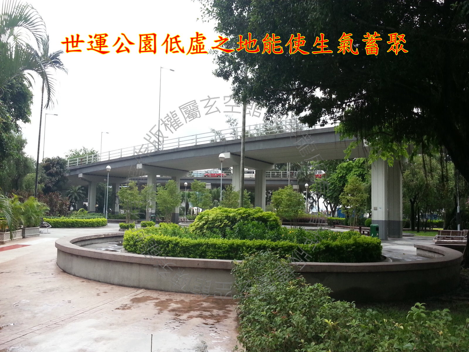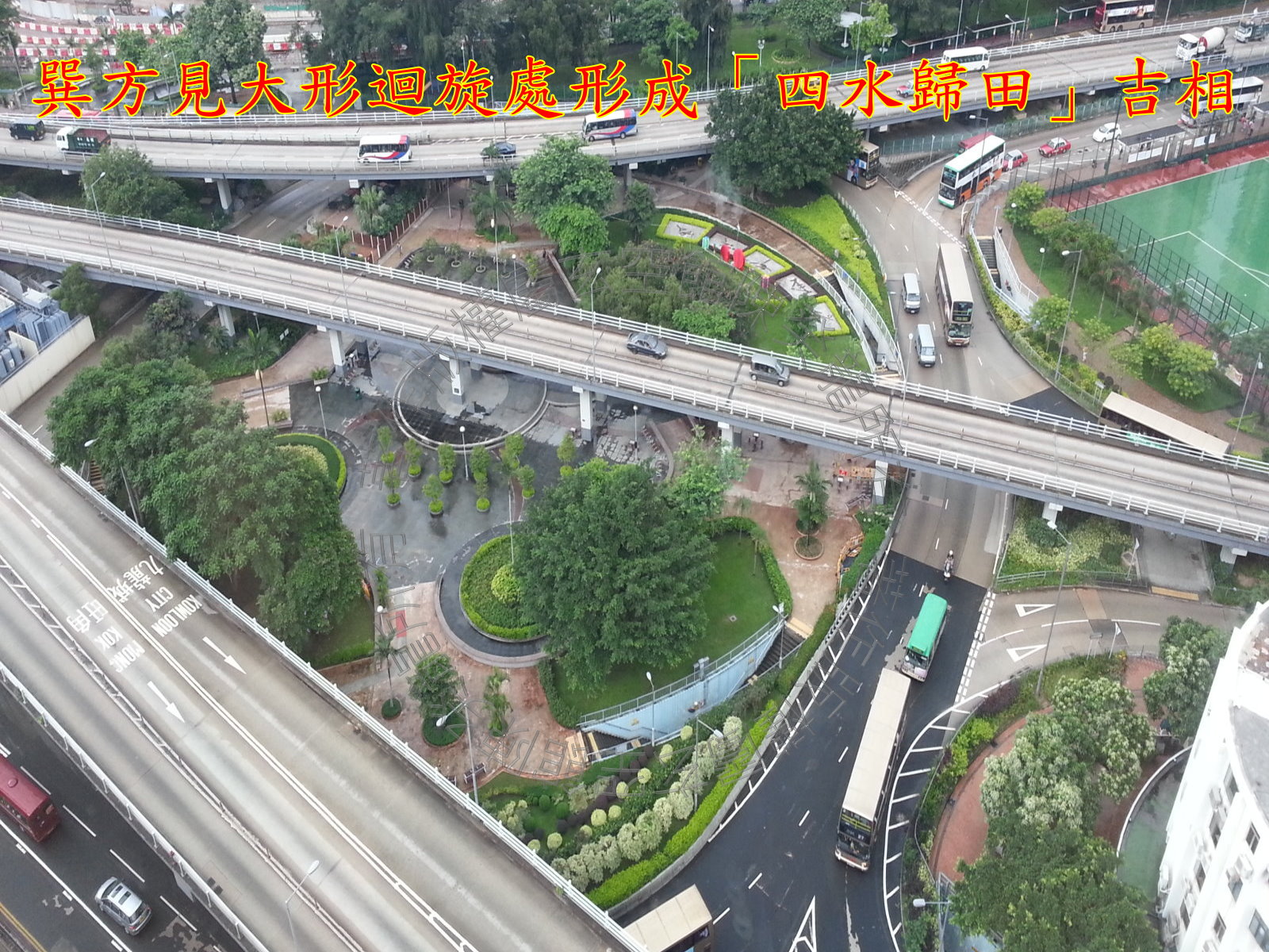 屋苑巽方见大形回旋处,形成风水学上的四水归田之吉相,气路交错,旺气自生。 而大形回旋处包围着世运公园,公园低虚之地能使生气蓄聚,令星喜低虚之地,如令星到宫,气运得通。