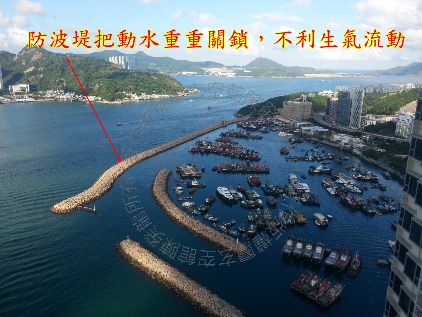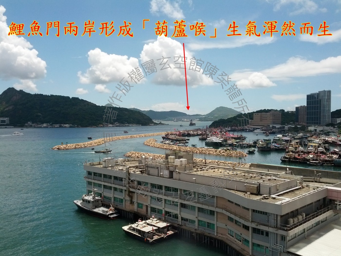 东面近方见爱秩湾避风塘,防波堤把动水重重关锁,不利生气流动; 幸好远方外巒见鲤鱼门水口,鲤鱼门两岸为维多利亚港做成风水学上「葫芦喉」的形态,形成一个大水收小水的收纳格局,生气浑然而生,力量远大于近方之咎,因此财星或城门到临此方位,必以吉论。