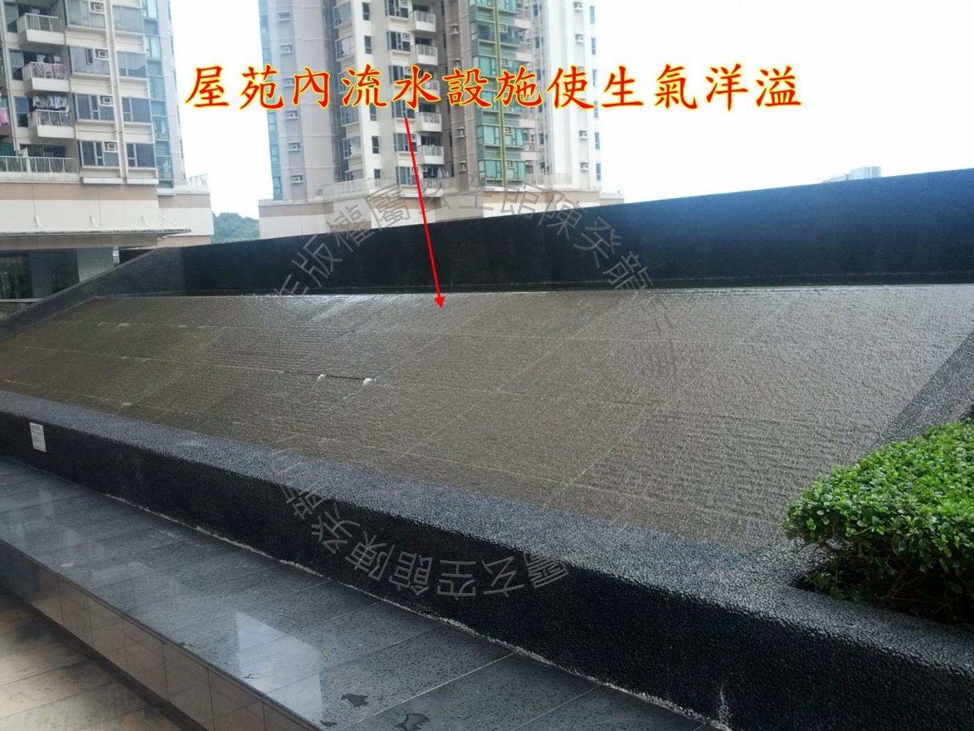 屋苑内到处可见流水设施,而且在平台亦设有泳池,生气洋溢,此等设置对屋苑内住户的财运甚有帮助。