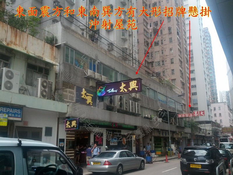 在内街方向,较远方东面震宫见渣华道街市,街市的瘴污之气产生味煞,主要影响住户健康。 而近方和富道,在东面震方和东南巽方有一些大形招牌悬挂,招牌会冲射屋苑一些较近的低层住户,不为美。