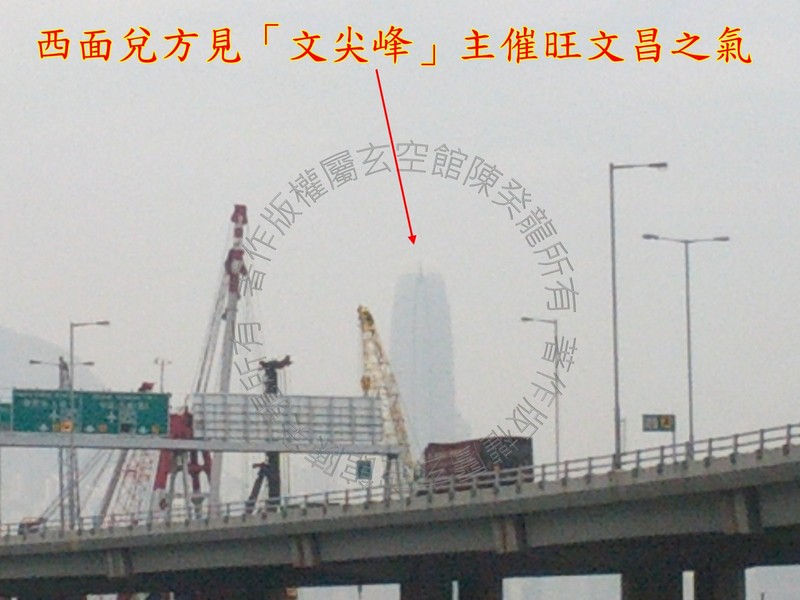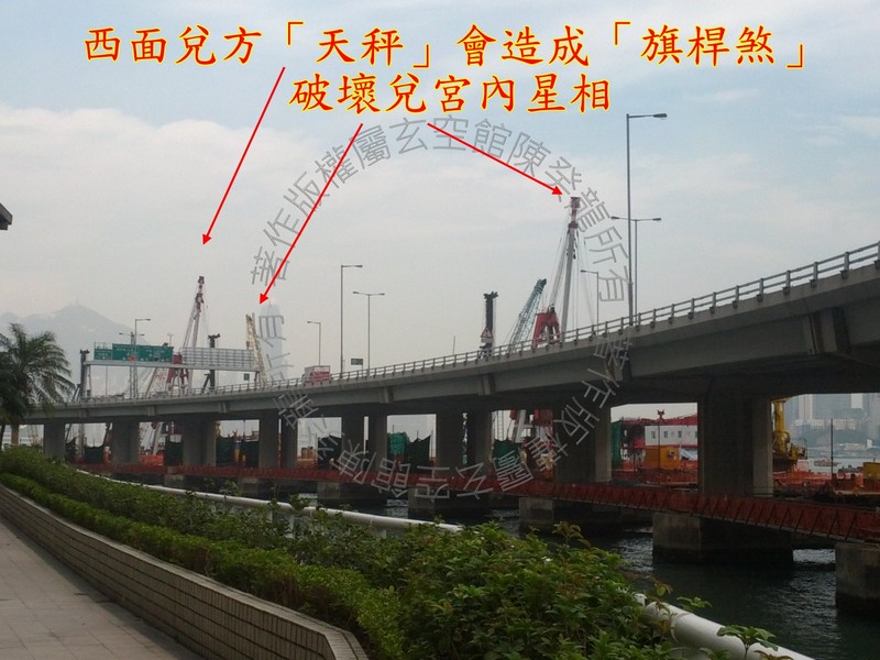西面兑方亦有吉有凶,较近方正在进行填海工程,竖立了不少「天秤」,「天秤」会造成「旗杆煞」破坏兑宫内星辰气流,令星相不良的一面得以彰显。 而远方收到港岛区最高的国际金融中心二期,视为风水学上文尖峰,主催旺家宅内的文昌之气。
