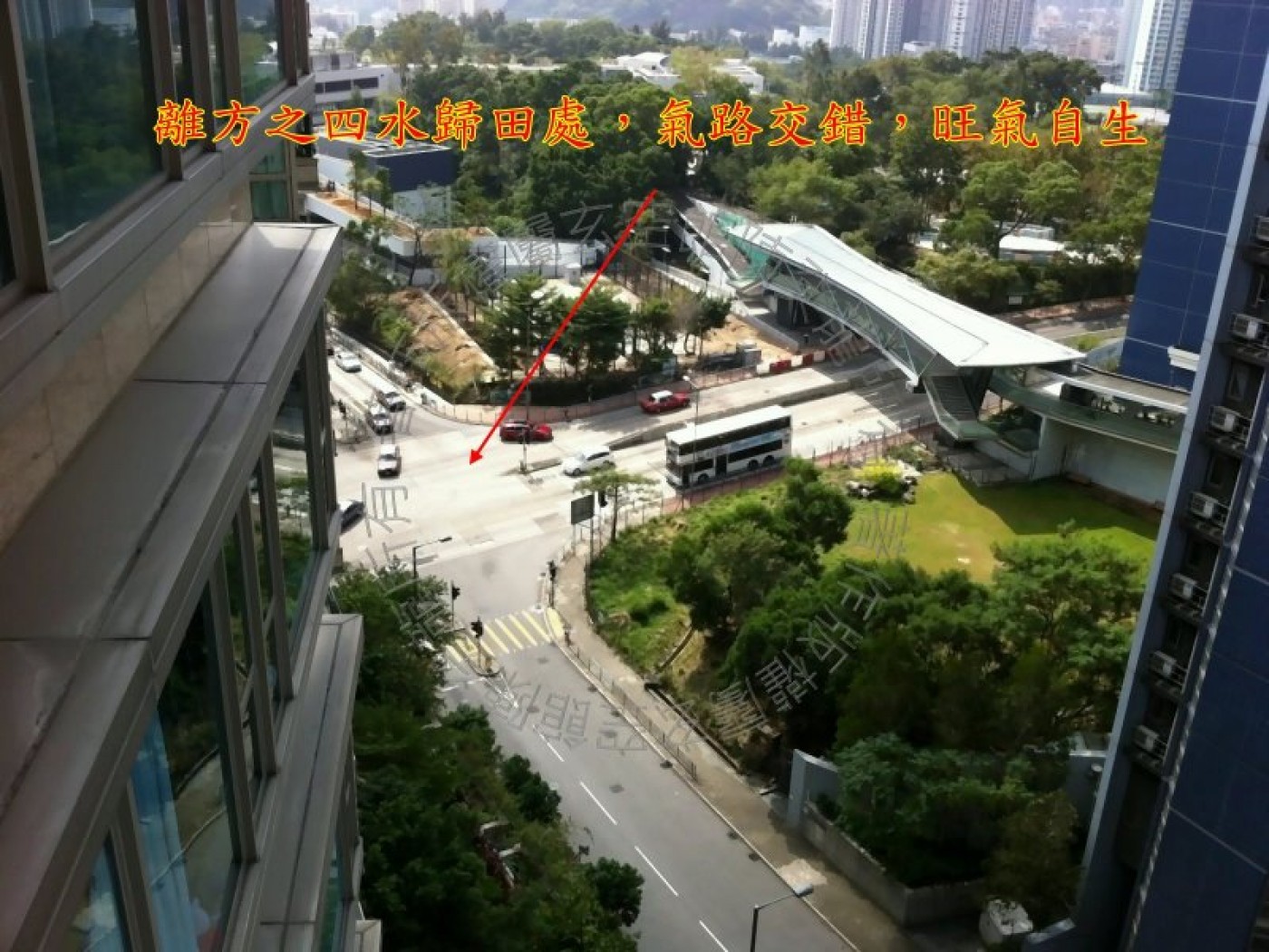 南面离方是歌和老街与达之路及达康路交会之四水归田处,气路交错,旺气自生。 石峡尾公园生气喜蓄聚,财富于虚。 除此之外,跨越歌和老街的行人天桥,桥板高压,前朝气阻不吉。 还幸屋苑此方设有水帘可化「陆桥煞」且更可加强四水归田所衍生的生气,固水帘不宜长期关闭。 此方还需注意香港城市大学在平洋中耸立形成之形煞。