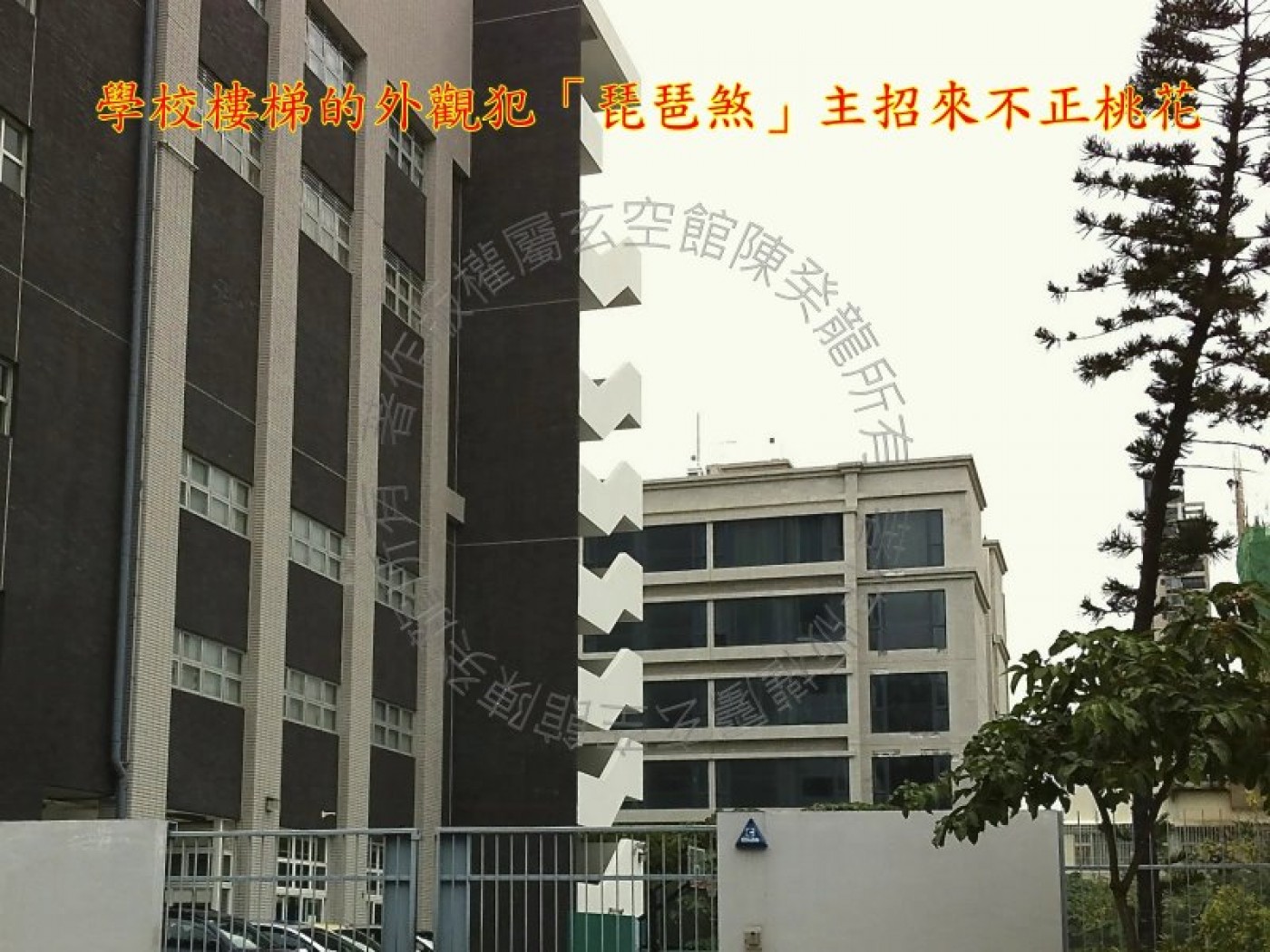 西南面坤方、西面兑方及东北面乾方,则须留意位于此的「香港培道中学校」有否带来声煞。 学校楼梯的外观犯「琵琶煞」,气流经过成桃花煞,招来不正桃花。 过度美化的学校建筑物犯「廉刀煞」,是卦之人伦受损,飞星组合的坏影响得到彰显。