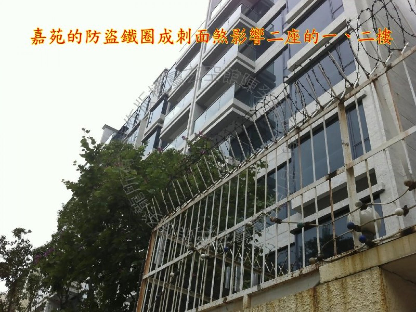 龙苑北面坎方嘉林边道,交会东宝庭道,成三叉水口,旺气自生。 东北面艮方乃九龙寨城公园气聚之所,令星及城门均喜低虚之地。 嘉苑的防盗铁圈成刺面煞,影响龙苑第二座的一楼及二楼。