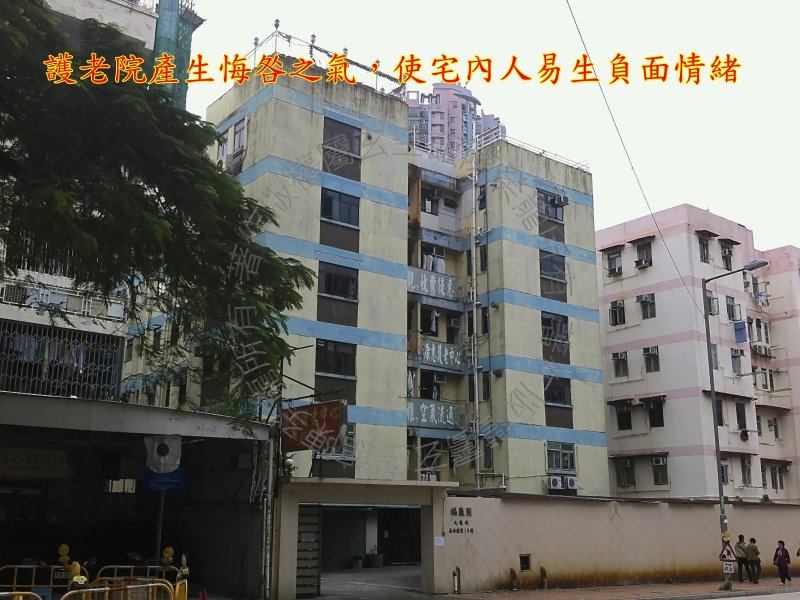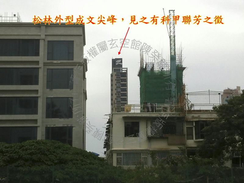东面震方松林外型成文尖峯,见之有科甲联芳之征,奈何大厦屋顶的「Z」形招牌,晚上亮时则成霓虹灯影会成火卦。 东面震方及东北面艮方应须留意耀山学校有否带来声煞。 东南面巽方有一护老院产生悔咎之气,使宅内人易生负面情绪及影响健康运。