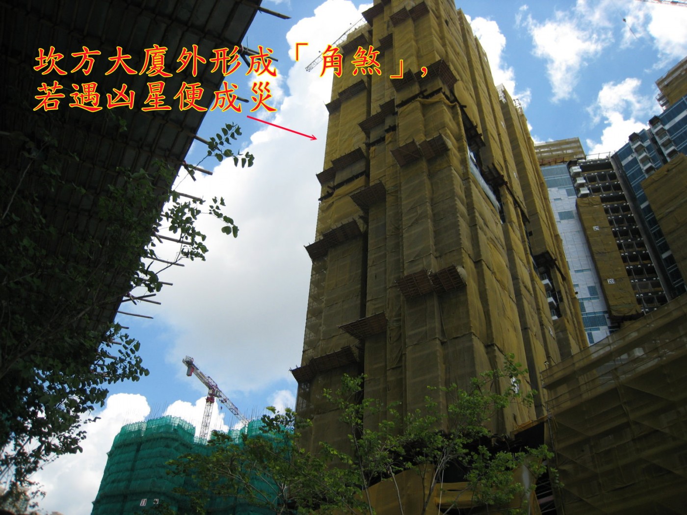 屋苑北面坎方,见对面Parkside,其外形成「角煞」,因距离较近,气场受冲过犹,对宫内飞星必彰显其弊,而气场受破坏之情况,要视乎宫内星辰,若此宫遇吉星,其吉相会有所压抑,若遇丁星,则有损人丁健康,情况尤以低层及中层住户影响为甚。
