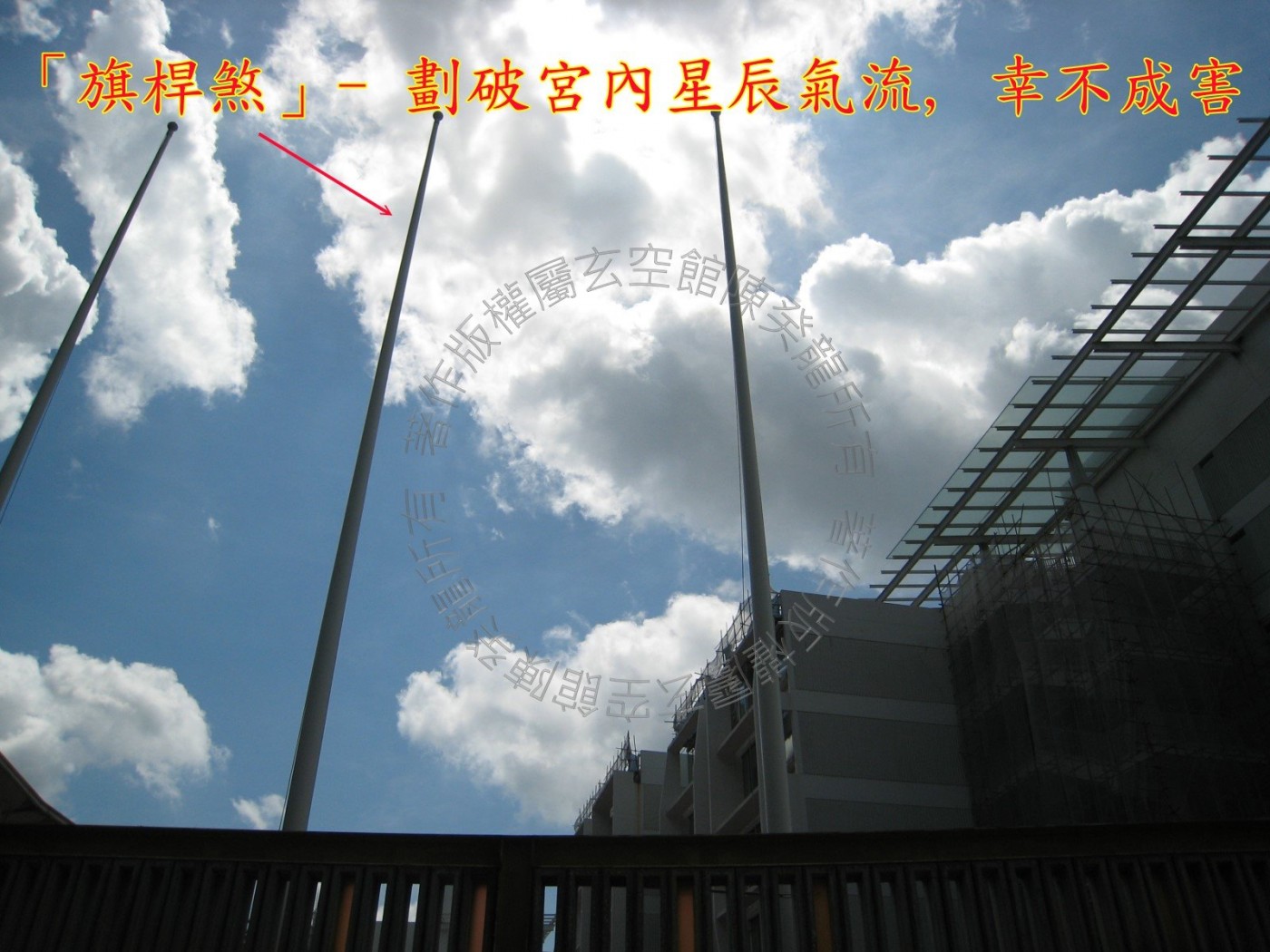 东面震方,东南巽方远见下洋山,山脉丰盈,山富人富,山瘦人饥,且外形成文尖峰,见之有科甲联芳之征。 惟邻近垃圾堆填区,实为可惜。 另震方见播道书院, 当须注意声煞。 且此方竖三枝旗杆,形成「旗杆煞」,划破宫内辰星气流,若此宫遇害星,则增加破坏性,幸旗杆并不高大,故不成害。