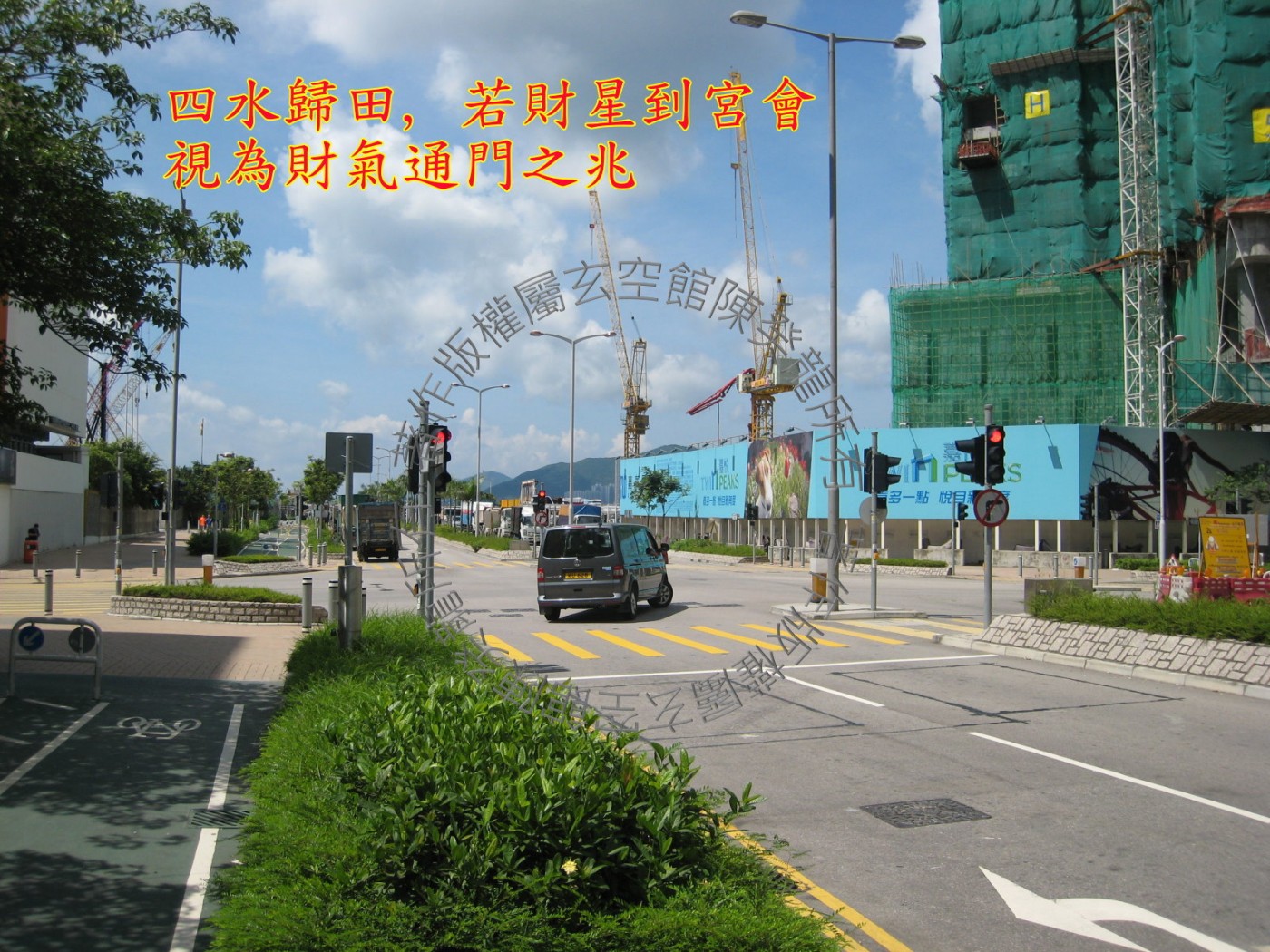 东北艮方甚为开扬,见唐俊街,礼乐街及至善街的十字路口,称为「四水归田」, 「若得乱流如织锦,不分元运也亨通」,气路交错,若加上财星到宫,会视为财气通门户之兆。 可惜此方见循道衞理小学,学校铃声钟响形成声煞,声煞会破坏气场之稳定性,须加注意。