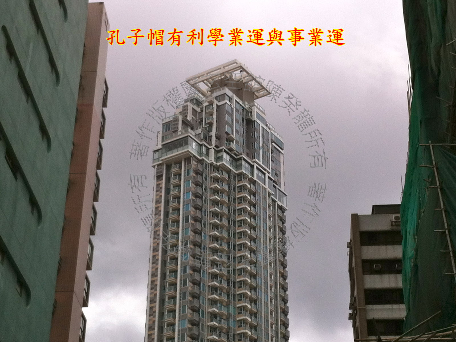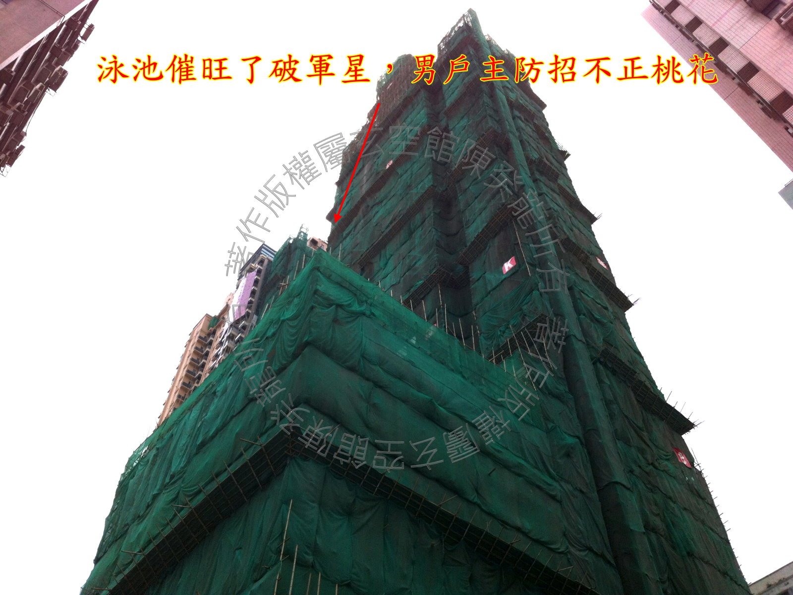 两幢大厦立线得玄空四大盘理排行第二的双星到向佳局,惟兼盘气埸较杂乱,宅内人情绪及运势较不稳定,有待大厦落成后一段日子,气埸渐趋稳定,则有所改善。 八运令星双双到兑,土星在金乡克出,力不强,山管人丁,水主财,此方不见山,反见加油站,气煞不利健康运; 近处不见真水,远方巒头喜见新油麻地避风塘,财运尚佳,第二座高层单位乾宫城门兼收四水归田及公园空地,财运较为优胜。
