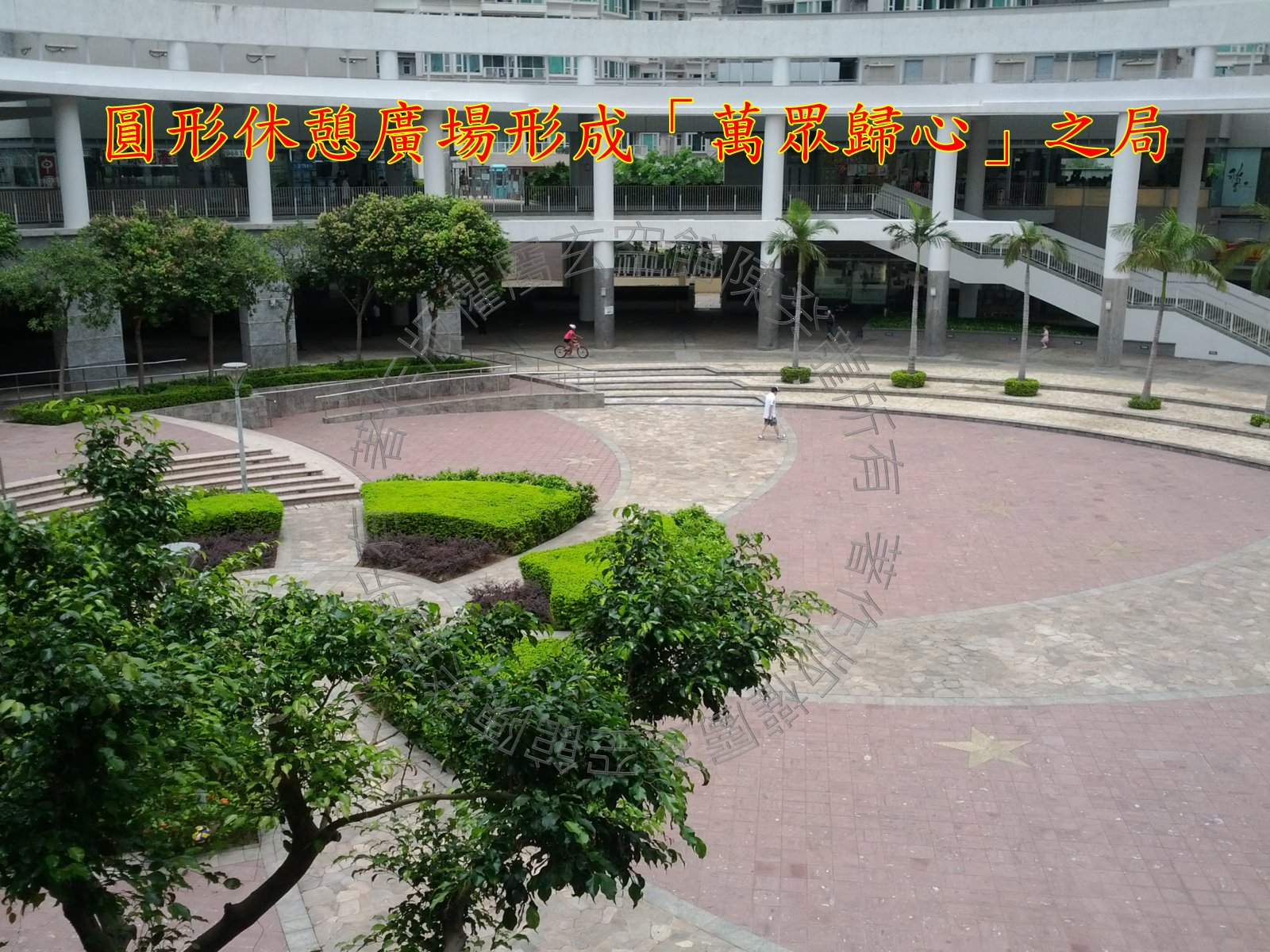 屋苑西北乾方有一大形的圆形休憩广场,贯通整个屋苑一至四期,各方气路在此盘踞而立,形成名为「万众归心」之局,而八运时期,一至六座城门刚巧落于此方,因此屋苑住户整体在财运上会有所提升。