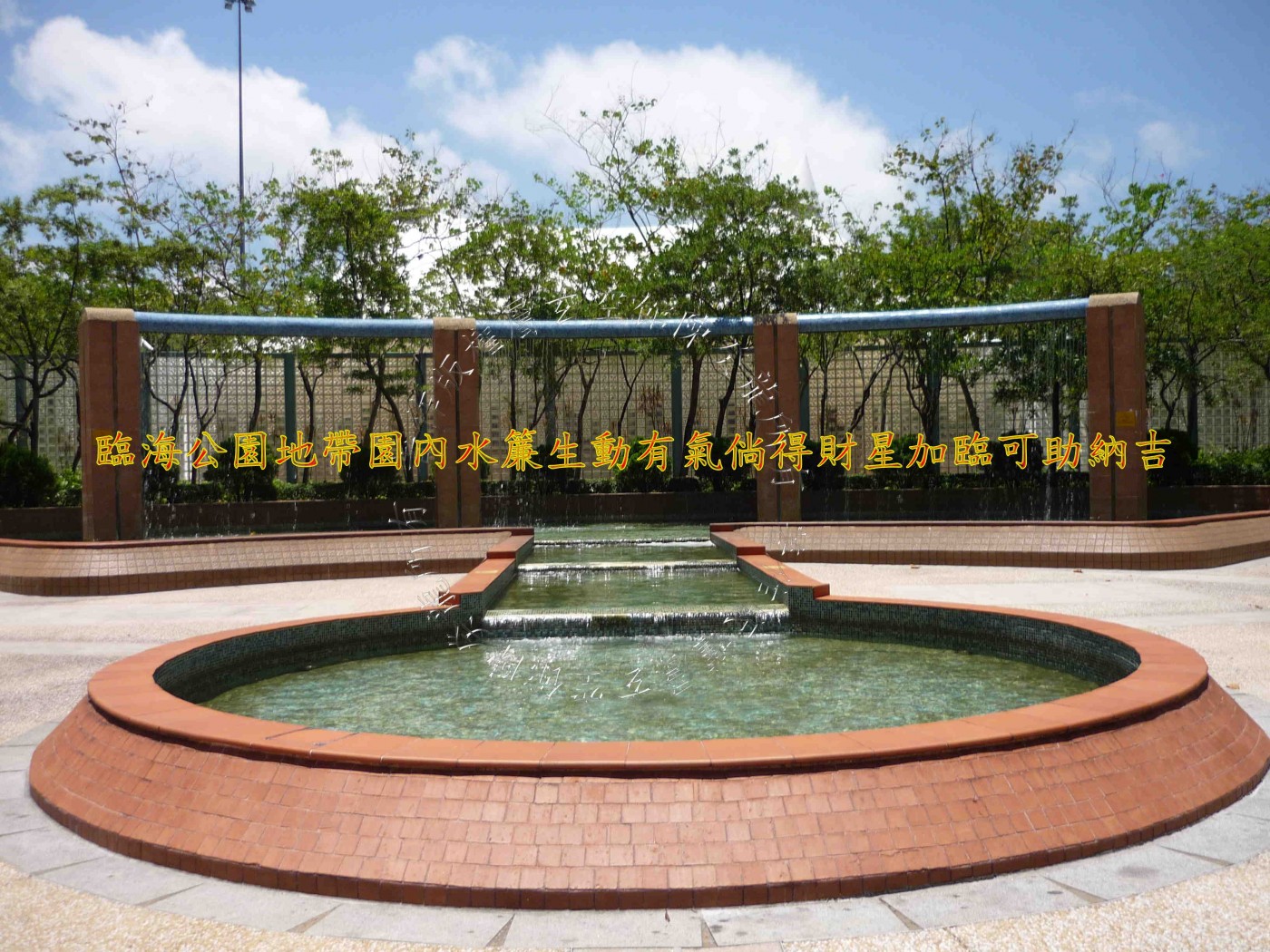 屋苑之南面离方及西南坤方为临海公园地带,园内水帘,生动有气,倘得财星加临,可助纳吉。 西面兑方见建筑地盘,勘察期间正值动土开始,成动土煞,不利健康。 另恐日后建筑期间,定有天秤吊臂冲射,其效验需观宫内星卦性情矣。 平台上筑有假山池水,惟池态欠美,且水流乏力,催财之力有限。 部份低层单位外墙设有防盗栏杆,恐成箭煞之弊。