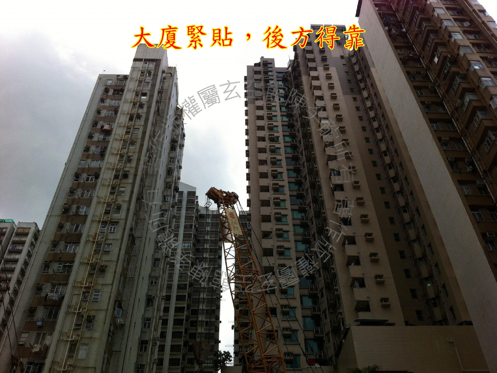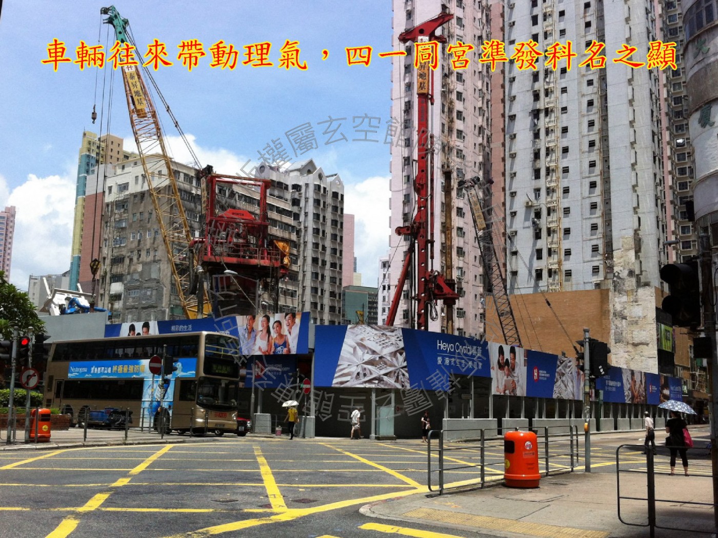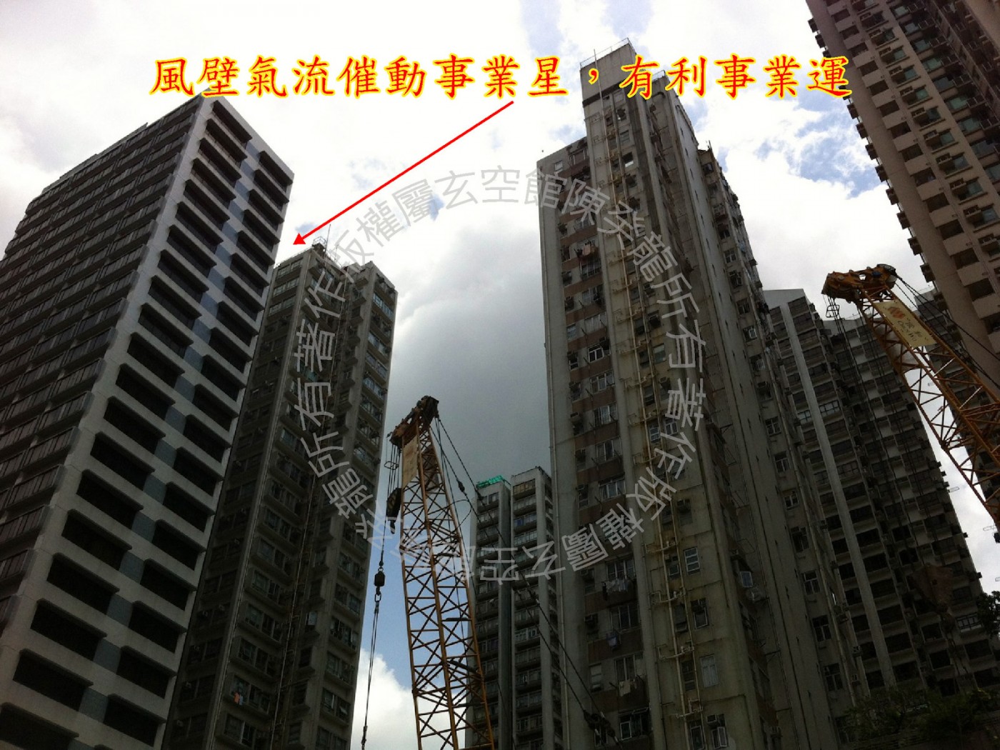 西南面坤方是青山道单程行车路,横水右倒左,惟直水无情,主财来财去。 西面兑方,是青山道交昌华街,虽是来水,但单程行车,左右分支,催财之力减。 东北面干方两排大厦之间的缝隙成风壁,气流催动事业星,有利事业运。