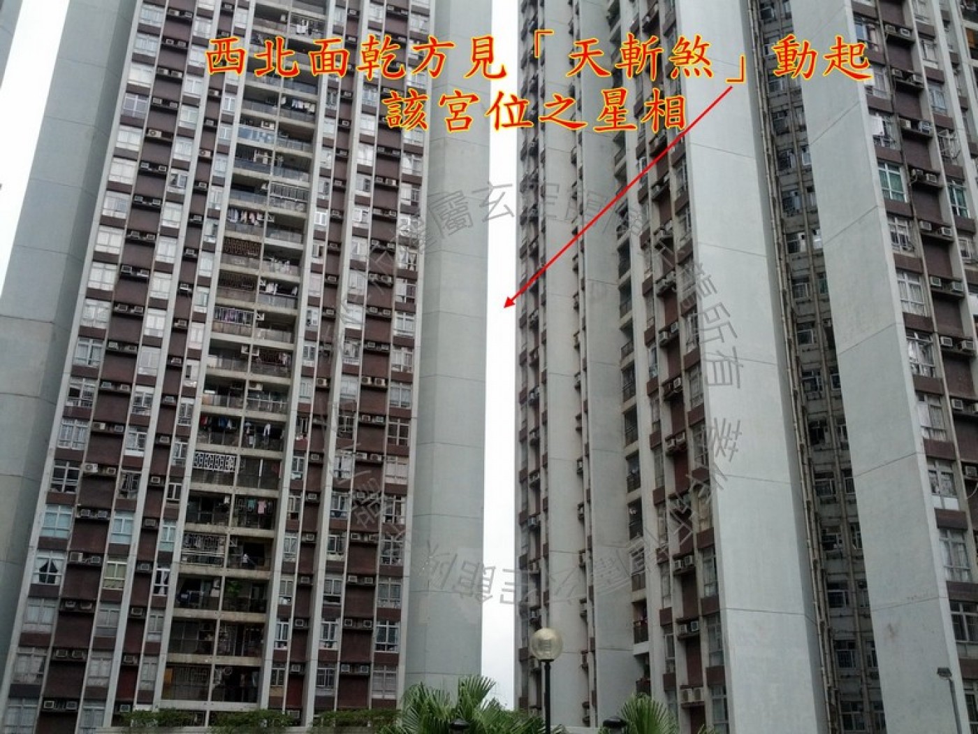 西北面乾方见「天斩煞」,当中成因是海景花园的青松阁与高安阁两座大厦之间的空隙,配合气流流过动起了该宫位之星相,尤幸高安阁北方坎宫星相组合佳,文昌气盛。