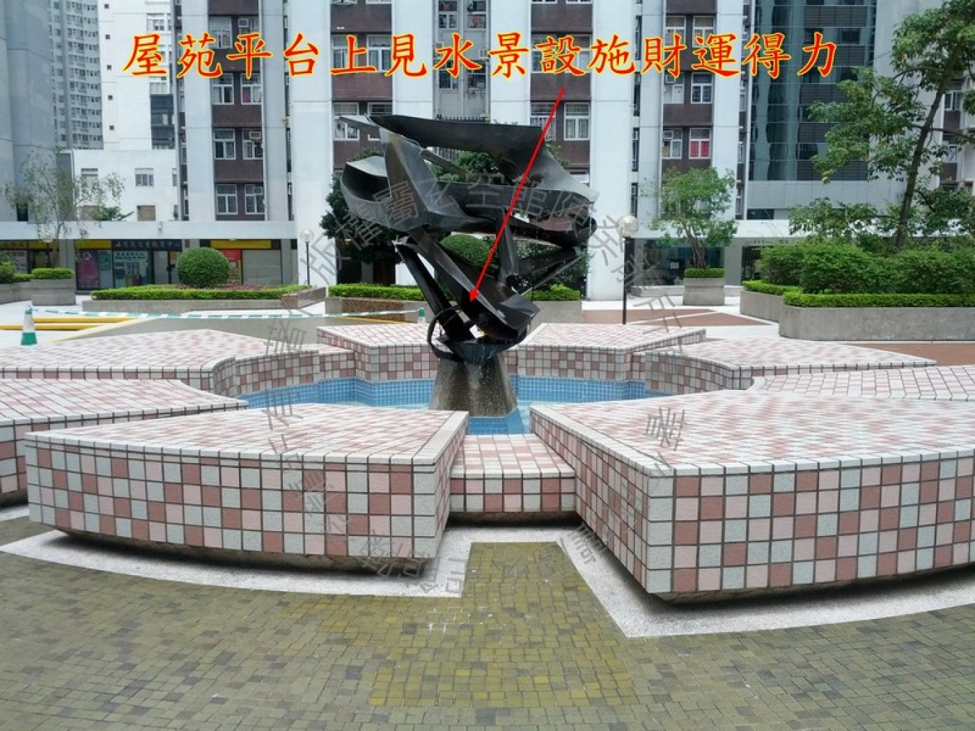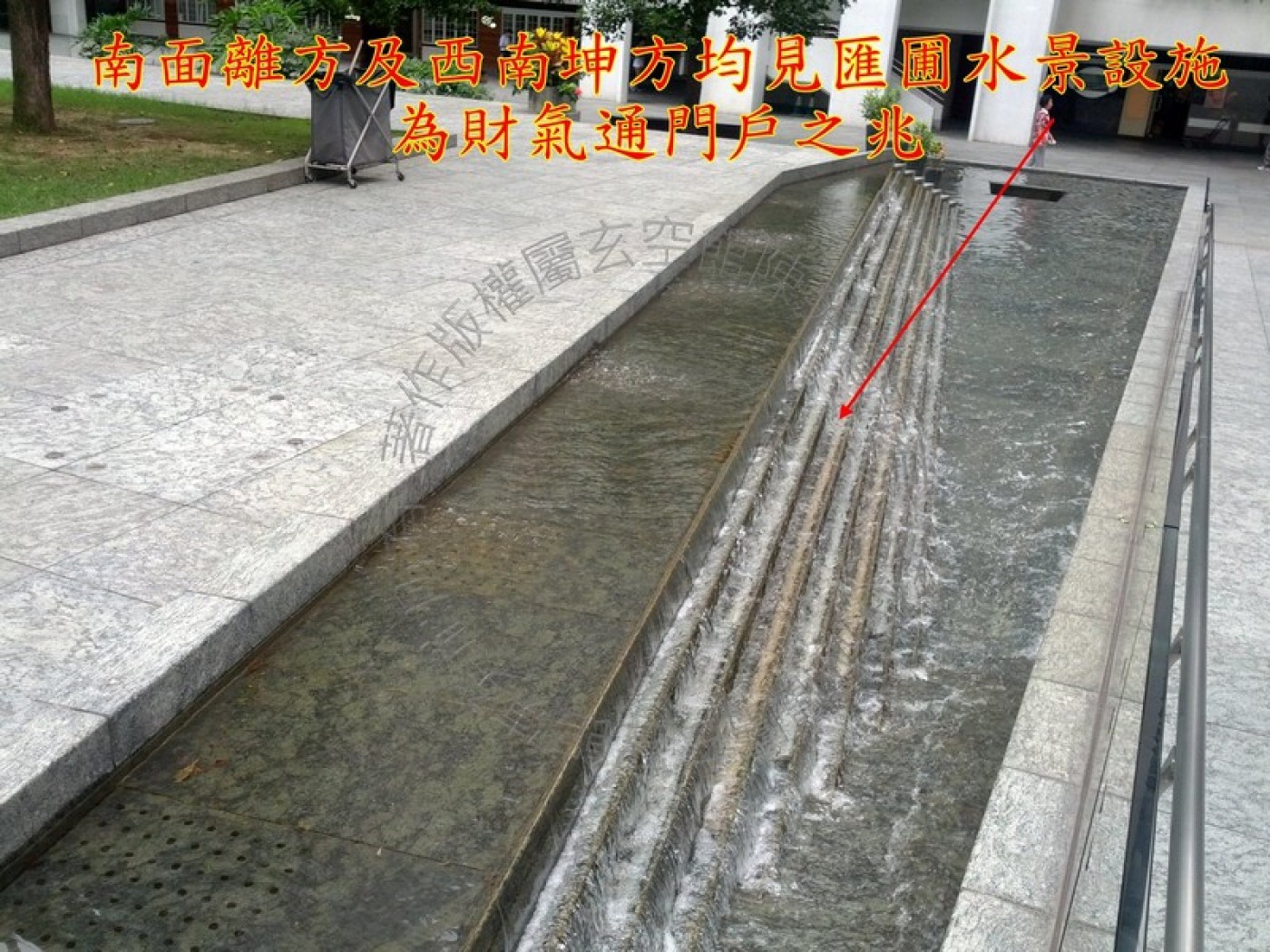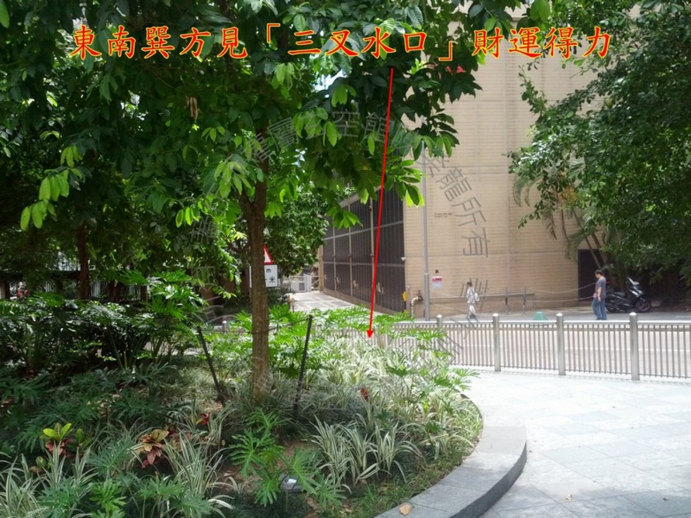 南面离方,甚至西南坤方均见汇圃水景及水池设施,生气洋溢,界水丛生,旺气自生; 另外,屋苑平台上亦见水景设施,如财富得到,为财气通门户之兆。