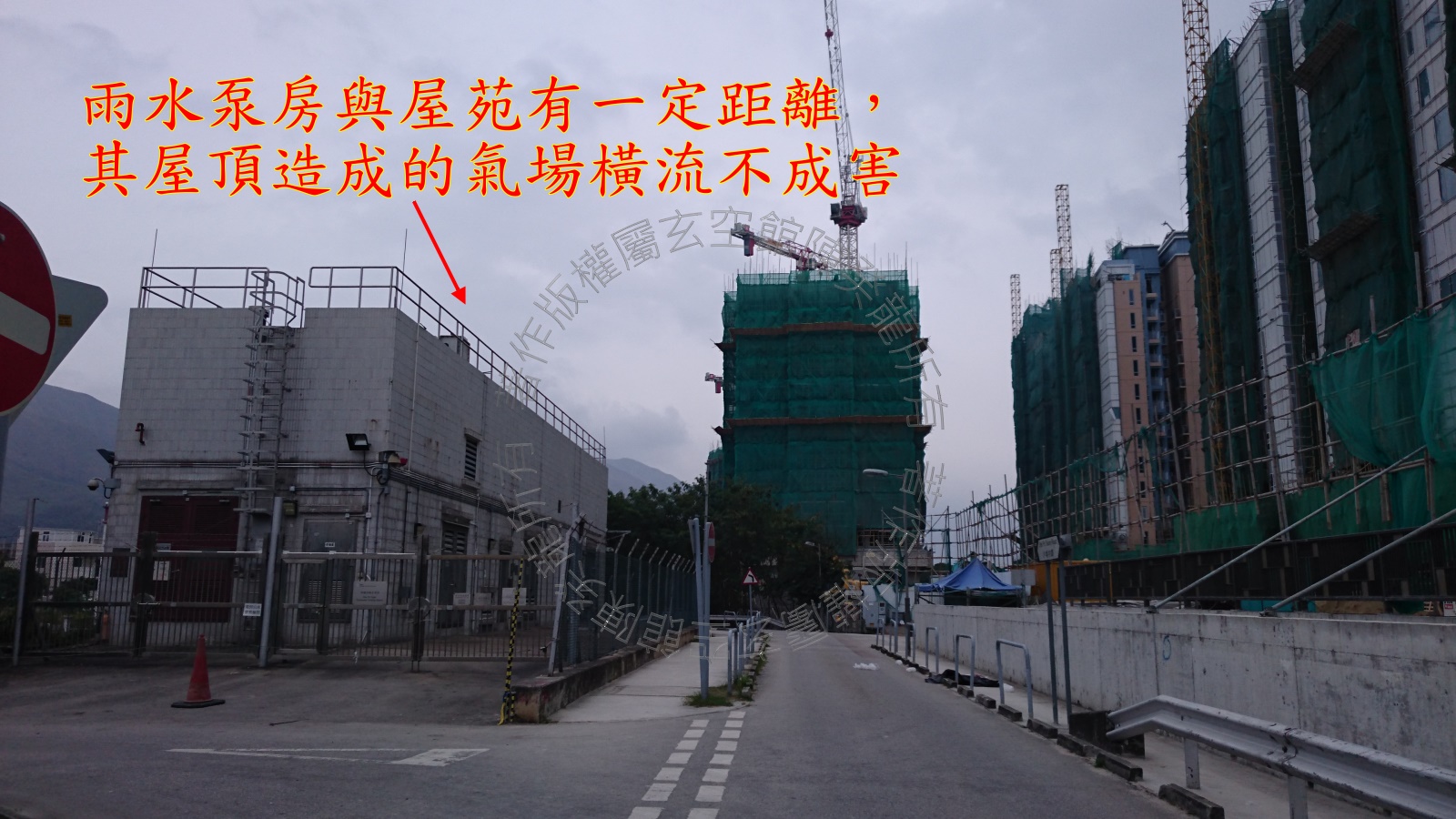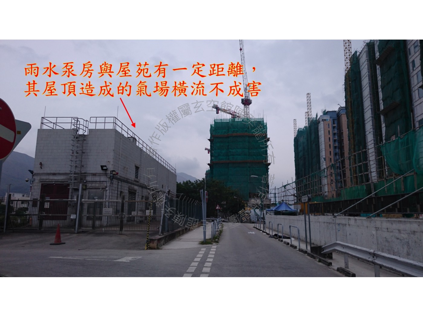 然而,于此方见一雨水泵房,其形成方状,房内机器成动象,幸未对外围造成破害; 惟此泵房仍不宜太近房屋,恐风吹过此房屋顶时,导致气流横行,气场不稳,故1A期对正此泵房的单位要多加注意。 幸此房仅为雨水泵房而非变电站,否则火气太重会成煞。