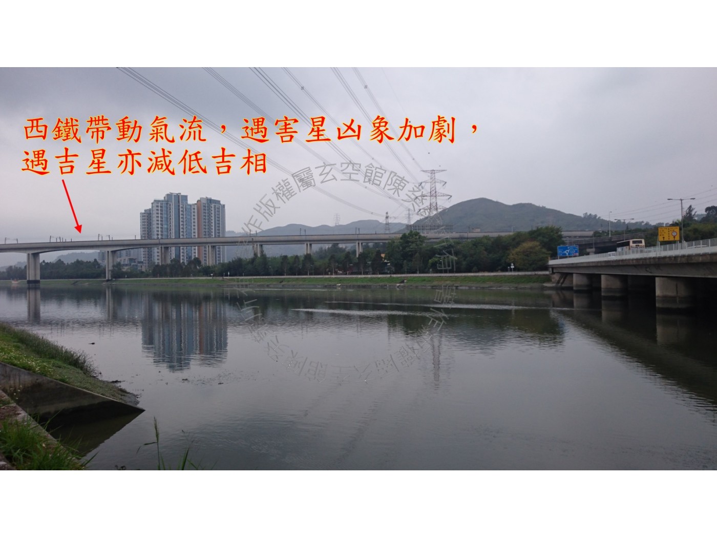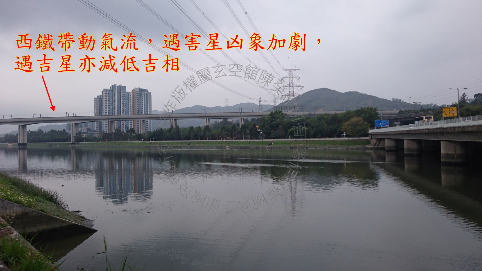 离宫南方,可西铁列车架空的行车路段,造成「横水直过」,由于列车全天繁忙运作,来来往往,都将气场带走,若此宫挨得凶星,其凶相会大增; 若挨得旺星,其吉相亦会扣减。 虽然屋苑与铁路有一定距离,且班次亦非频繁,其力度稍为下降,但其影响性仍不容忽视,须以风水物象稳定气场。