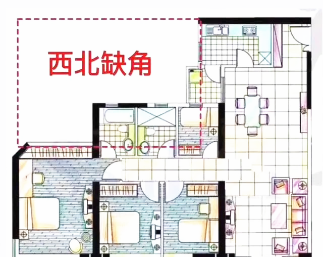 乾位代表父亲、领导、上司、贵人、官府,方位在西北方;坤,代表母亲、执行者、贵人、财富、配合、包容,方位在西南方。办公室或居家风水中若乾坤二位缺失,则事业开展不顺,领导能力欠佳,与人合作不愉快,财运不佳,事业衰败。反应到人事上就是对领导上司不尊敬,对父母尽孝不够,领导他人难以服众。 东南西北是四正位,也是桃花位置,此位宜方正,每个方位的空间大小宜整齐统一,宜干净明亮。若四方位大小不一,斜角、圆角凸出,则心中存邪,缺乏正气,事业生活均不顺利,导致理想愿望难以实现。个人则贪淫好色,身体受损,影响事业的发展,不得人心。千万不要把厕所设立在家中最重要的位置上,厕所是家中的藏污纳垢的地方,如果厕所位于家中的吉位,会严重地影响家中的风水。既不能聚财,还会影响到家人的运势和健康,带来病痛。横梁对风水格局的影响是巨大的,如果办公室在横梁处,那么就有大问题了,事业运被压制,上升就较难了,因此选择办公位置时,一定不要靠近横梁,尽量远离这个位置,如果实在不方便挪动工位,那就将办公桌上方的横梁装潢一下遮挡起来。有楼梯的房子往往是复式楼或是别墅,这些地方才有可能出现上下结构,楼梯放在房中央,风水学上是以河洛方化演化而来,最主要的理论点就是九宫图。九宫中央是立极点,是主静极状态的地方,也是为囚的地方,所以这个地方作为出入口,有动起静的作用,也有因为囚地的原因造成不吉,就是以环境来看,也是不利的结构,所以,楼梯放在房子中央是不利的。一个房子就是一个太极点,每个房间也是一个太极点,既然是太极点就要分开主次结构,一个房子好坏和客厅的关系是较大的,因为客厅大为阳,为主;卧室房间为阴,为次,客厅又是活动场所,因而,客厅按要求是要大于卧室房间。但现在有的人为了追求一些理想化生活,把房间打通,造成房间过大,反而客厅偏小,这个可以叫为小马拉大车,为主次不分的说法,这种房子不利财运,不利于人际关系的发展。事业的阻力也会较大。