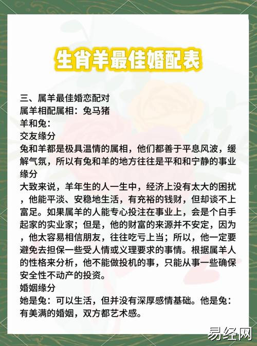 2025最新属羊人最佳配对是 男兔女羊最佳配对是什么意思?,最新生肖运势由易经网整理发布!,2025最新属羊人最佳配对是男兔女羊最佳配对是什么意思?2025年属羊人与属兔人的配对被广泛认为是最佳组合之一。从生肖角度来看,羊和兔同为六合,象征着和谐与默契。男兔女羊的配对在感情、事业和生活中都能形成良好的互补关系。属兔的男性通常性格温和、细心体贴,而属羊的女性则温柔善良、富有同情心。两者在一起能够相互理解、支持,共同面对生活中的挑战。此外,2025年的运势也表明,这对组合在事业和财运上都有不错的发展机会。整体来看,男兔女羊的配对不仅符合传统生肖理论,也能在现实中建立稳定幸福的关系。