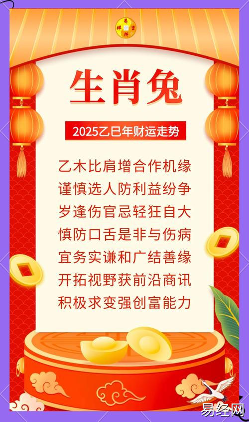 易经网推荐2025最新属兔2025年财运方向 2025年属兔佩戴饰物是什么意思?,最新生肖运势,下面是详细内容: 2025年乙巳蛇年,生肖兔的朋友们面临着机遇与挑战并存的财运格局。精确把握财运方向,对投资...
