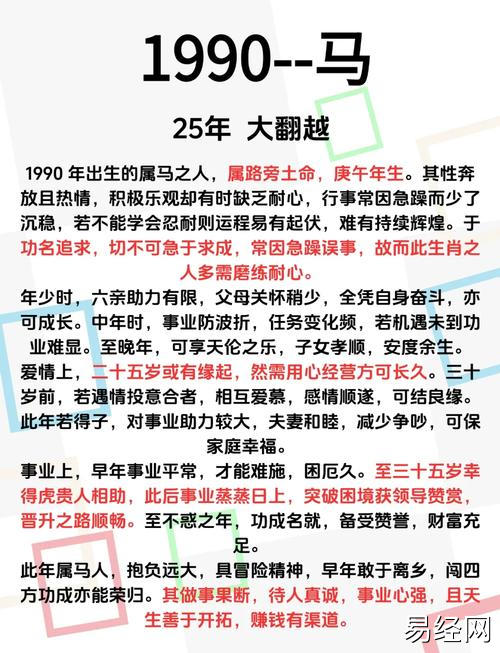 易经网推荐2025最新1990年的属马人的婚姻 1990年属马的婚姻与命运是什么意思?,最新生肖运势,下面是详细内容: 缘分桃花 1990年属马人乃庚午年生,天干庚金,地支午火,五行属金,命理五行以火为正缘...