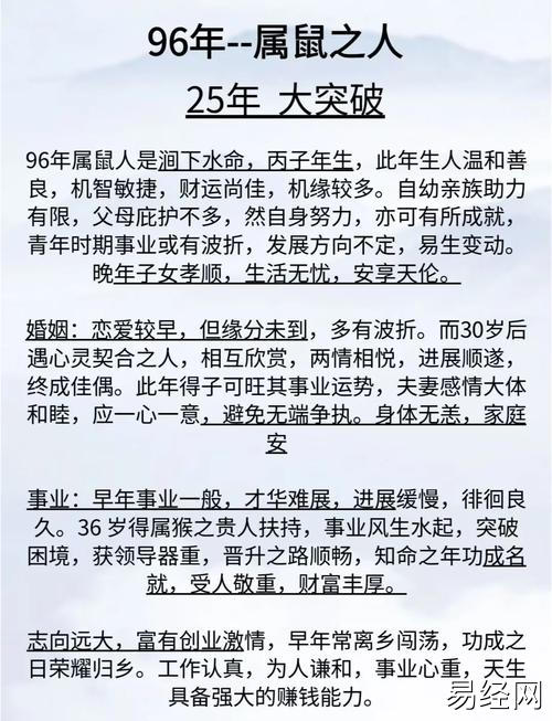易经网推荐2025最新1996年的属鼠人婚姻 1996年属鼠的人女的婚姻怎么样是什么意思?,最新生肖运势,下面是详细内容: 1996年属鼠人,生于农历丙子年,生肖鼠文化中象征智慧、机智与活力。他们天生具备良...
