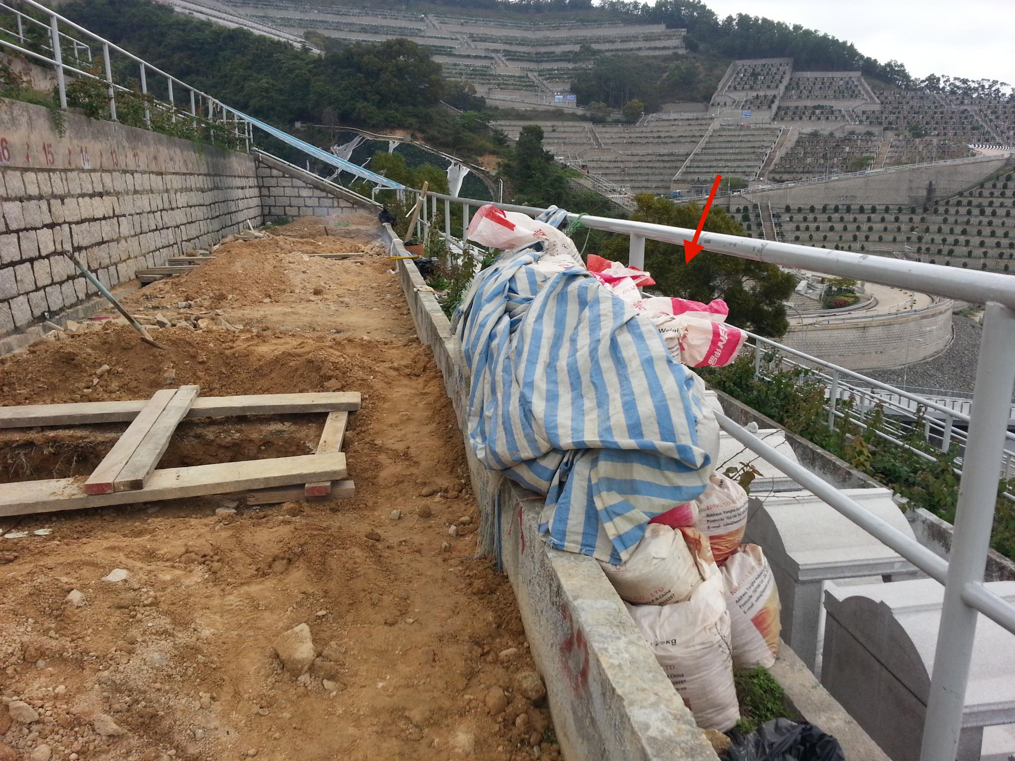 见照片中墓穴左下有老树植于前,此形势怕树根穿棺,尤以松树、柏树、杉树及榕树等为根部生长快且扩散范围大的为最忧,如情况棺穿气露,其后人必出癌症、慢性心脏之疾、生痴呆智障之儿。