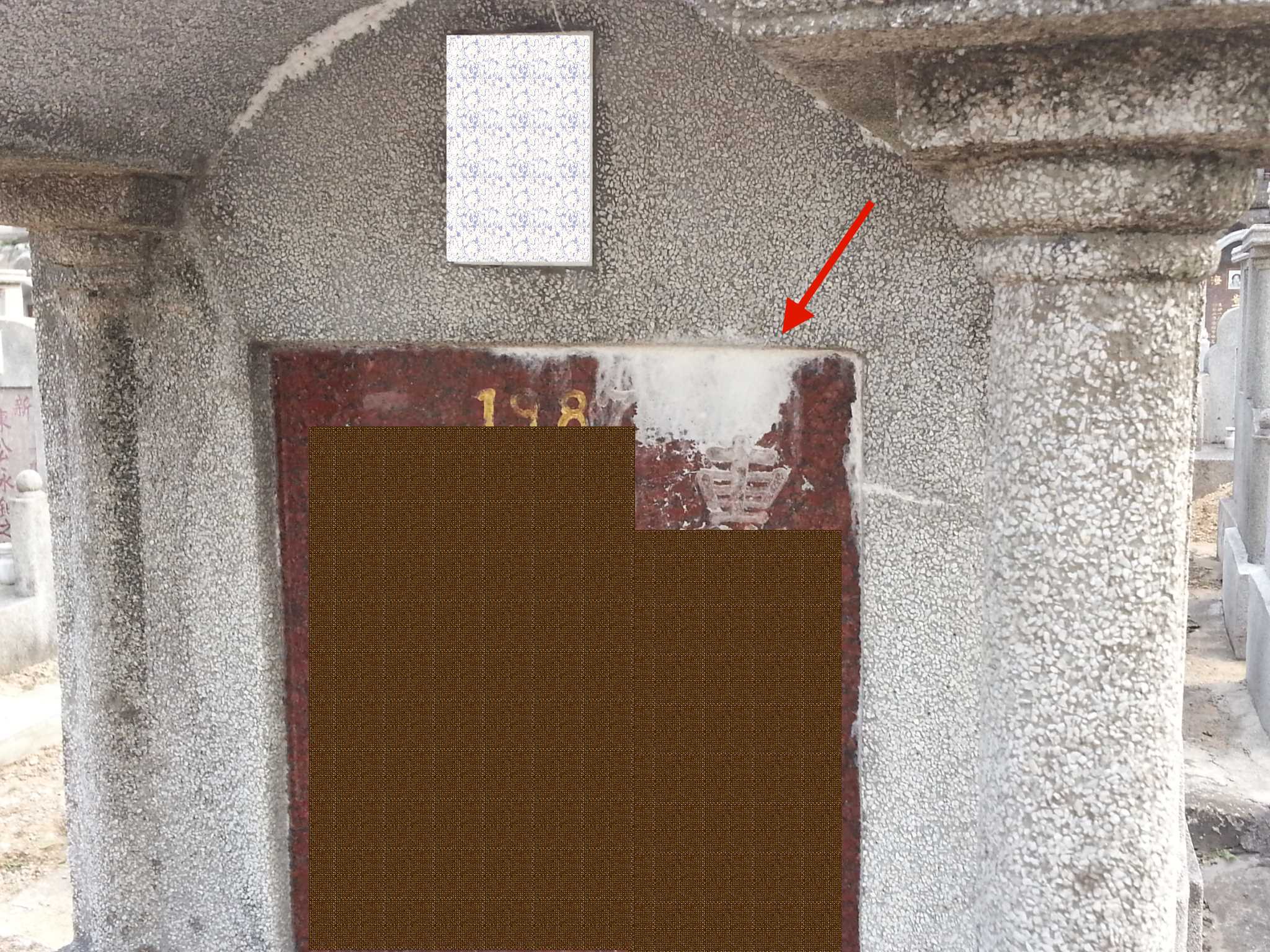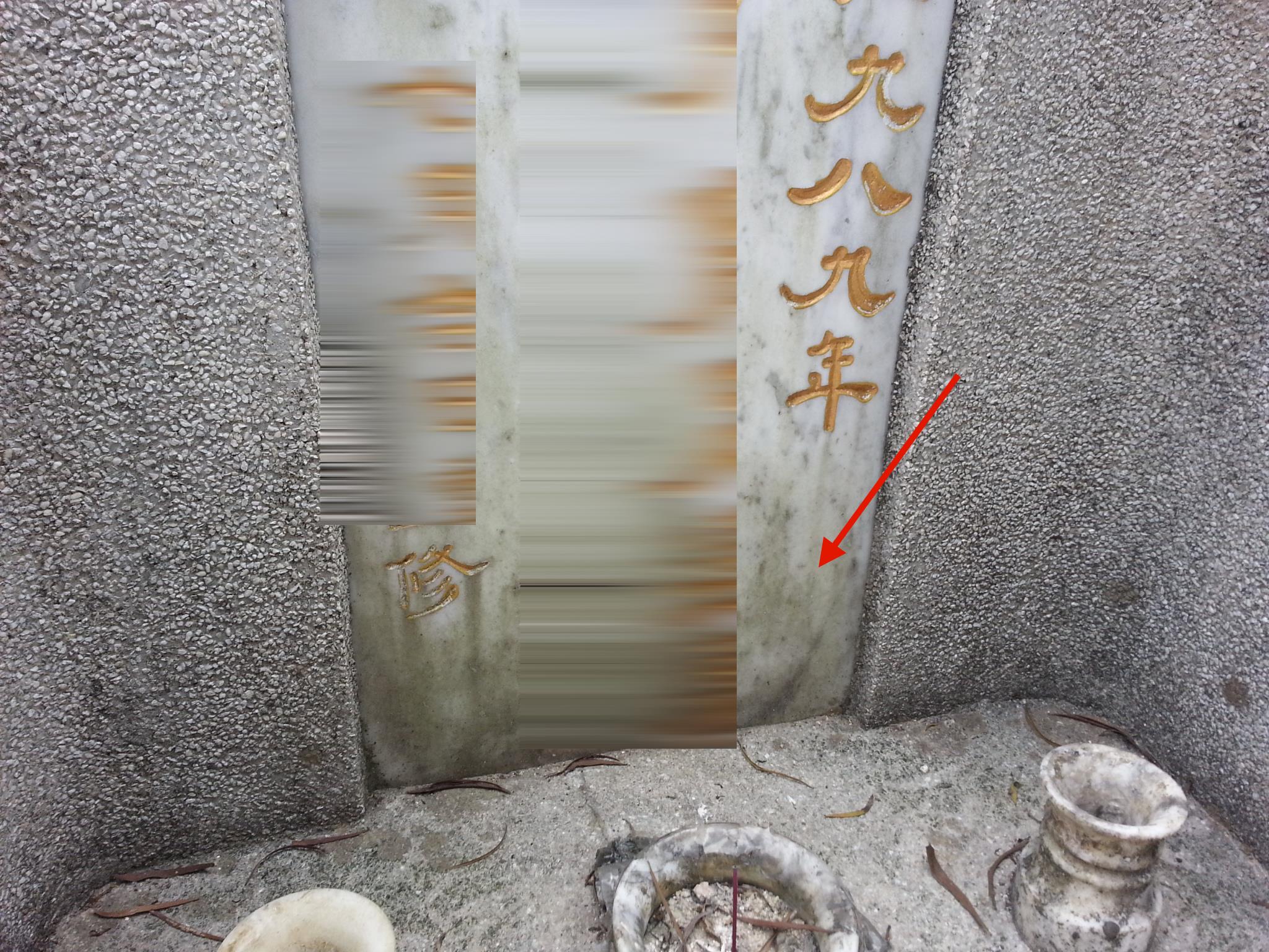 由碑中位置起发见茶水色,如云扩散到碑左或右,又或如布淋,由碑之上至下,像黄水留痕,最严重者是有如云状,由碑心发出而整体碑过皆见,应验于后人多生绝症,子孙续嗣有难,纵有子亦难养。