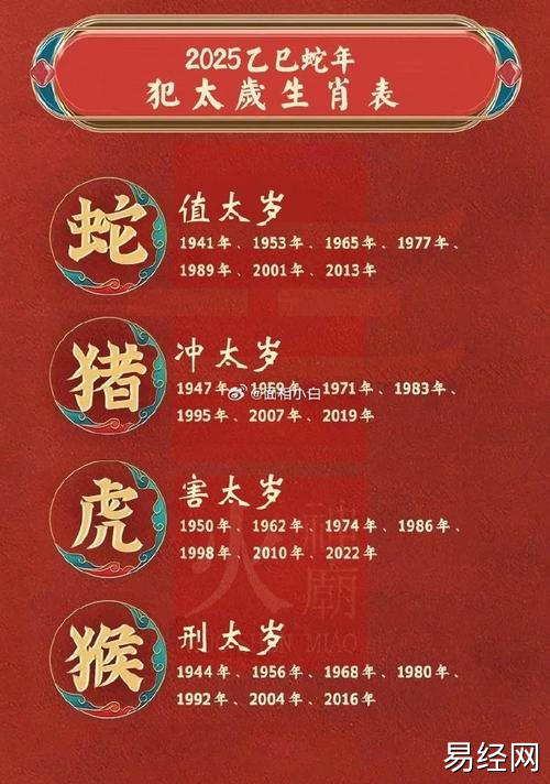 易经网推荐2025最新属蛇的犯太岁时间表 猴蛇双太岁如何化解是什么意思?,最新生肖运势,下面是详细内容: 犯太岁,一个常被提及的命理概念,指的是个人生肖与当年太岁(流年地支)产生不利关系。对于属...