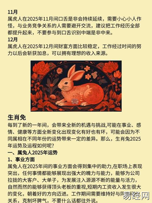 易经网推荐2025最新属兔属虎今年财运好不好 兔和虎适合做生意吗是什么意思?,最新生肖运势,下面是详细内容: 属兔 整体财运 兔年对于属兔人士而言,财运总体呈现 平稳上升 的趋势。由于三合贵人的帮...