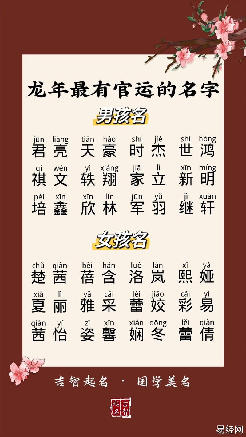 易经网推荐2025最新男宝属龙取名官运财运平安旺 龙男五行缺火最旺男孩名字是什么意思?,最新生肖运势,下面是详细内容: 一、生肖龙喜用字 五行属土的龙,喜用五行属金、木的字。金代表旺盛官运,木代表...