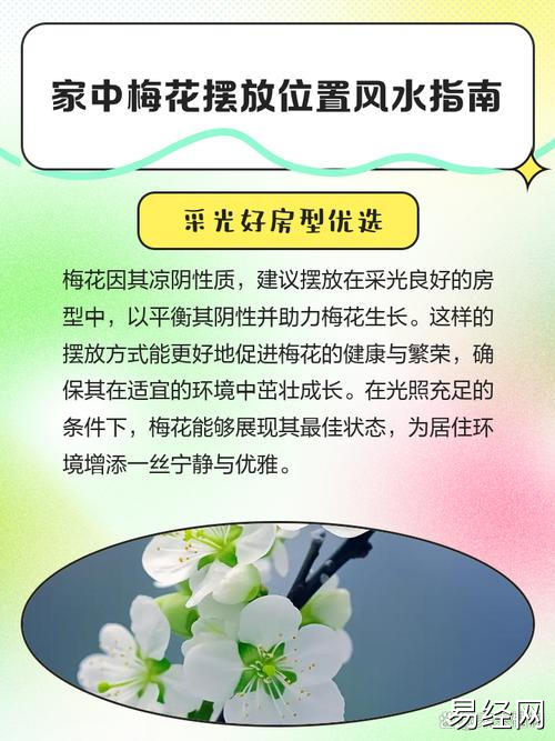根据最新易经风水要求,梅花摆放应结合整体布局,遵循五行相生原则。不同颜色梅花对应不同方位,需谨慎选择。切勿随意放置,以免破坏风水平衡。