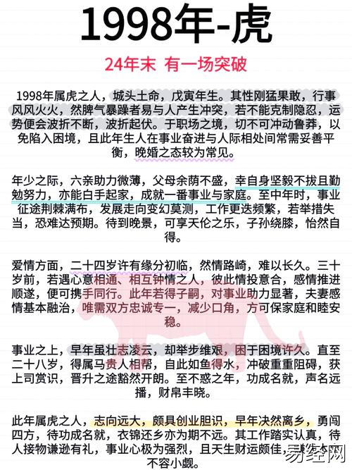 2025最新属虎的有事业的名人吗男 1998年属虎事业运哪几年最旺是什么意思?,最新生肖运势由易经网整理发布!,2025最新属虎的有事业的名人吗男?1998年属虎事业运哪几年最旺是什么意思?生肖运势是根据出生年份对应的生肖,结合传统命理学说,分析个人在不同年份的运势变化。1998年属虎的人,属相为虎,性格刚毅、自信、有领导力,适合从事需要决策和执行力的工作。事业运最旺的年份通常与五行相生、天干地支相合有关,如2023年、2024年、2025年等,这些年份可能带来升职、创业或合作机会。具体到个人,还需结合八字综合判断。