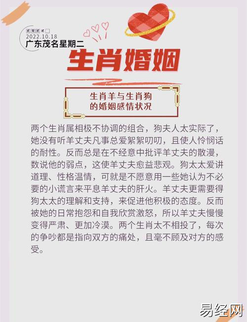 2025最新男属狗女羊婚姻 羊狗一窝必定富是什么意思?,最新生肖运势由易经网整理发布!,2025最新男属狗女羊婚姻,羊狗一窝必定富是什么意思?在传统生肖文化中,狗与羊的组合被认为是非常和谐的一对。狗忠诚、正直,羊温柔、善良,两者性格互补,容易建立稳定的家庭关系。所谓“羊狗一窝必定富”,是指这样的家庭不仅感情融洽,还能在事业和财富上取得成功。2025年,这对组合将迎来好运,尤其在事业和财运方面会有明显提升。不过,也需注意沟通方式,避免因小事产生误会。整体来看,2025年是羊狗夫妻携手共进的好时机。