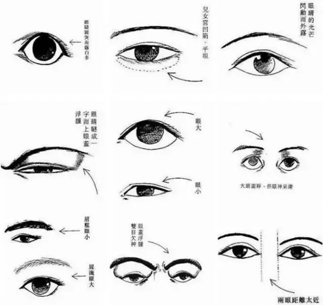 1. 《麻衣相法》谓:「眼如日月要分明,凤目龙睛切要清。最怕黄晴兼赤脉,一生凶害活无成。浮大羊睛必主凶,身孤无著货财空。细深多是无心腹,眼视之人不可逢。」意思是,眼睛应该清澈明亮,又黄又赤、浮突如羊眼、细深斜视都是不善的眼相,睛黄目赤的人命短;突眼的人容易倾家荡产;眼形细深的人冷酷多疑;目光斜视,在男人则狡黠,在女人则淫荡,这两种人都不可与之交往。