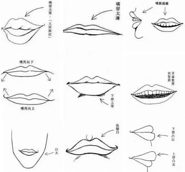 口尖如篓,与乞为邻。口如缩囊,饥饿无粮,纵然有子,必主别房。口如缩螺,常乐独歌。口边紫色,贪财妨害。口如撮紧,破产飘蓬。口不见齿,老亦成立。口唇乱纹,一世孤单。口如吹火,至老独坐。口上生纹,有约无成。轻薄口唇,惯说他人。口阔又丰,食禄万锺。口角向上弯,终身不怕难。