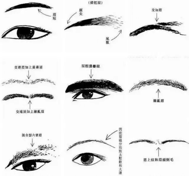 3. 眉忌短、忌散、忌杂。短则贫寒、散则孤苦、杂则粗俗。相理认为下列眉相非善:眉短于目性情孤僻;眉骨棱高多有磨难;眉散浓低一生孤贫;眉毛中断兄弟离散;眉毛逆生兄弟不和;眉不善眼孤单财败;眉交不分年岁难久;短促不足漂流孤独。