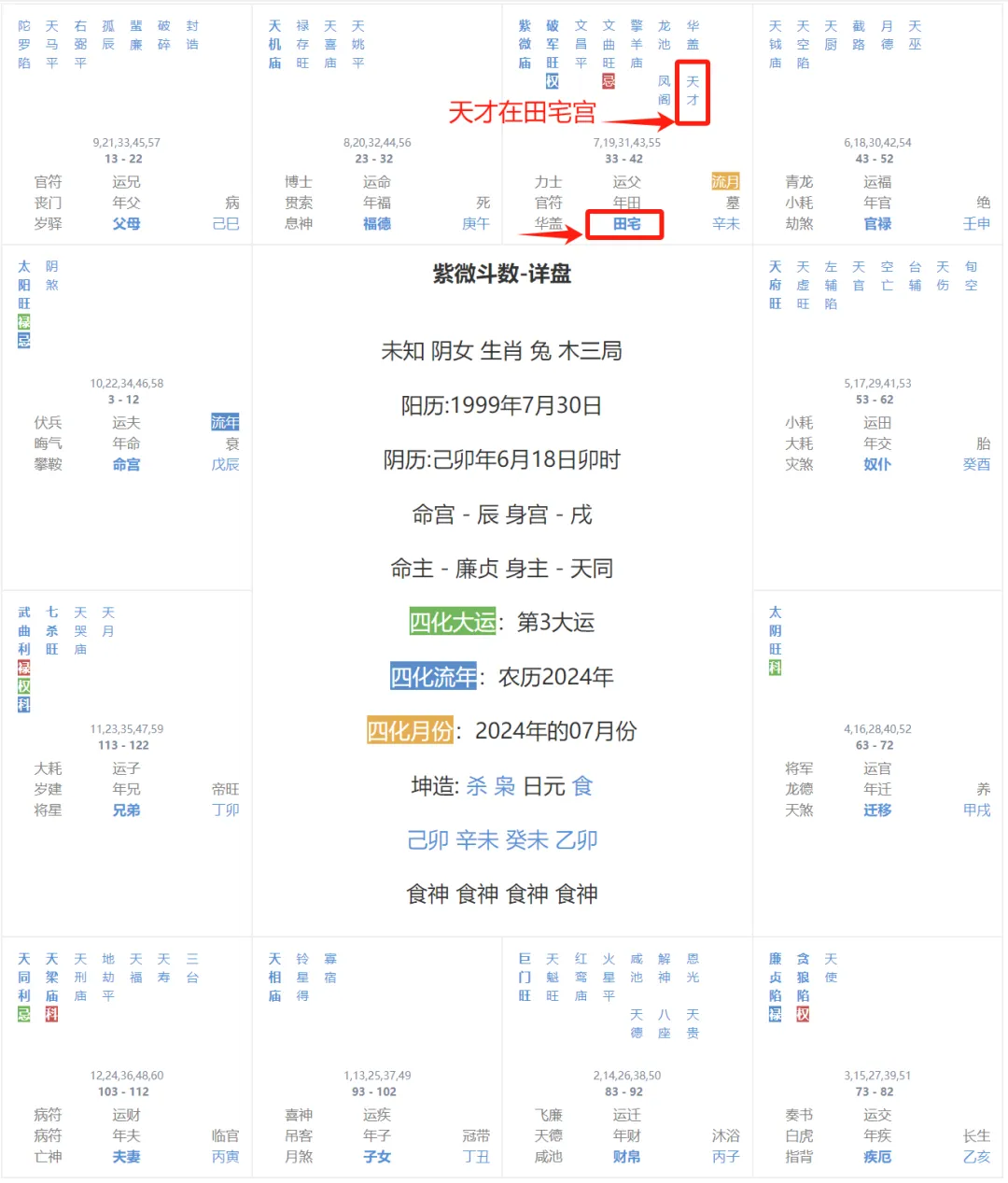请查看你的紫微星盘天才星落在什么宫位。 举个例子,如上图紫微星盘女命,天才星在流月田宅宫,可以从以下几个方面来理解: 创造力提升:天才星的出现可能会让你在这段时间内有更多的灵感,有利于创作、设计等方面的工作。 家庭和睦:天才星在田宅宫也有可能带来家庭关系的和谐,家人之间相处融洽,有利于家庭氛围的营造。 房产好运:在流月期间,你可能会有购房、租房或者其他与房产相关的机会,这些机会可能会给你带来一定的收益或者好运。 安全顺利:天才星在田宅宫还代表着在这段时间内,与房屋、家庭相关的事务会比较顺利,不会有太大的困扰或者问题。 请大家根据自己的紫微星盘情况对照文中描述查看参考。 天才星特性 天才星,属乙木,阴木之质,它是智慧与才能的化身,是天机星的得力助手,当它们同宫时,力量倍增。若它成为命宫的主星,那命主的面容,便像是被月光洗过的青白色,脸型圆长,身材中等偏上。 它的优点,就像是那些流转在都市夜色中的霓虹,让命主看起来聪明、机智,学习能力如同海绵吸水,记忆力惊人。 如果你的命宫出现这颗星,那么你会是性格开朗的人,同时才艺、才干、口才兼备,机敏、反应迅速,正直而仁慈,对环境的适应能力,就像是在风雨中摇曳却不倒的小草,能攻能守,能屈能伸。 但它的缺点,也如同霓虹灯下的阴影,让你看起来自视过高,聪明反被聪明误,才华横溢易招嫉妒,热情过度则劳心劳力,追求新鲜变化,却容易卷入是非之中。 洞烛机先的天才星,不仅是天机星的得力伙伴,更擅长分析、推理,拥有直觉和灵动的本能。然而,它对环境的超强适应力和快速反应,也为你带来了一丝神经质的脆弱。 它可能会让你因为敏感而神经衰弱,但热情的天才星,总能让你吸引众多朋友,而朋友的鼓励,就像是一剂良药,对于缓解压力、舒缓紧张,效果显著。